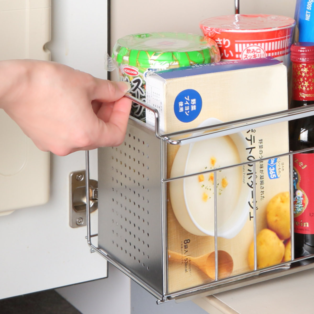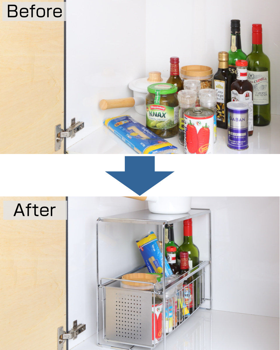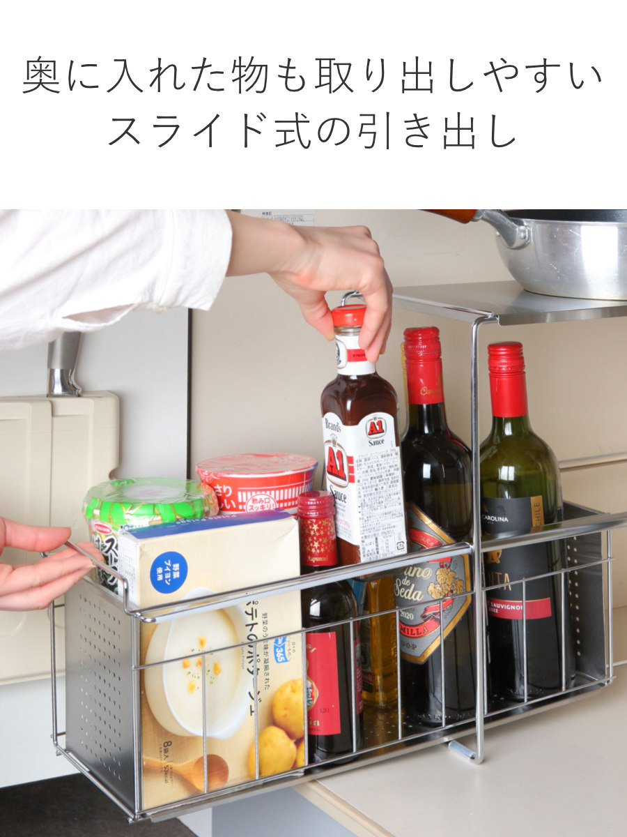 調味料や食品ストックなどで散らかりがちなシンク下をすっきり収納できるスライドラックです。抜群の収納力で背の高い醤油や油なども入れられます。シンクの下を占領していた調味料を整理することで、新たな収納スペースを確保することができます。