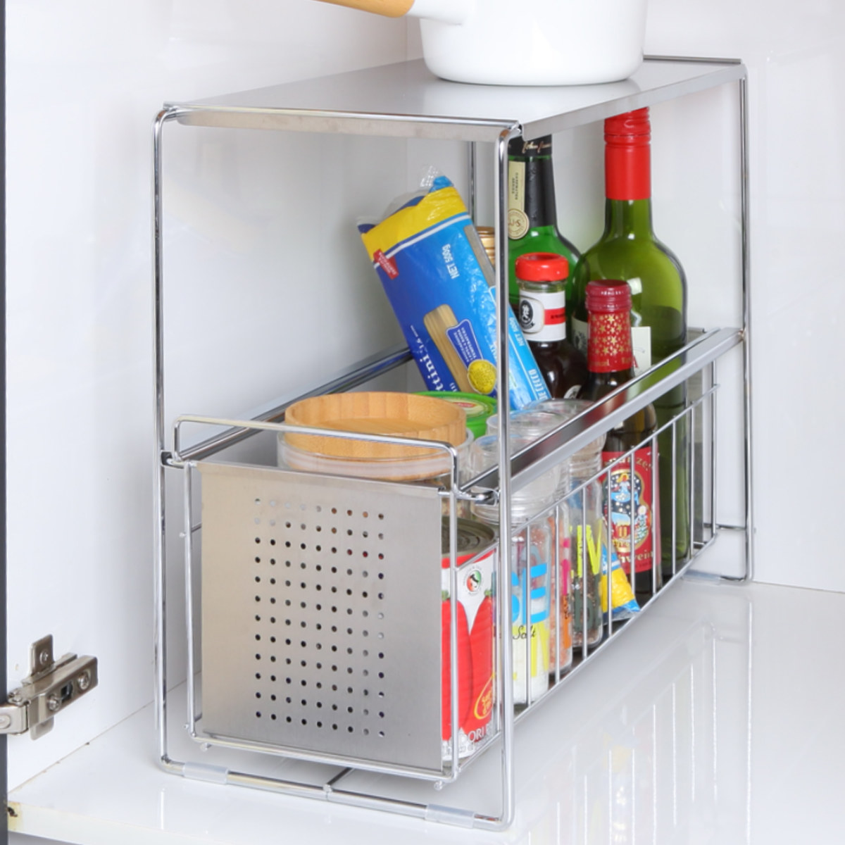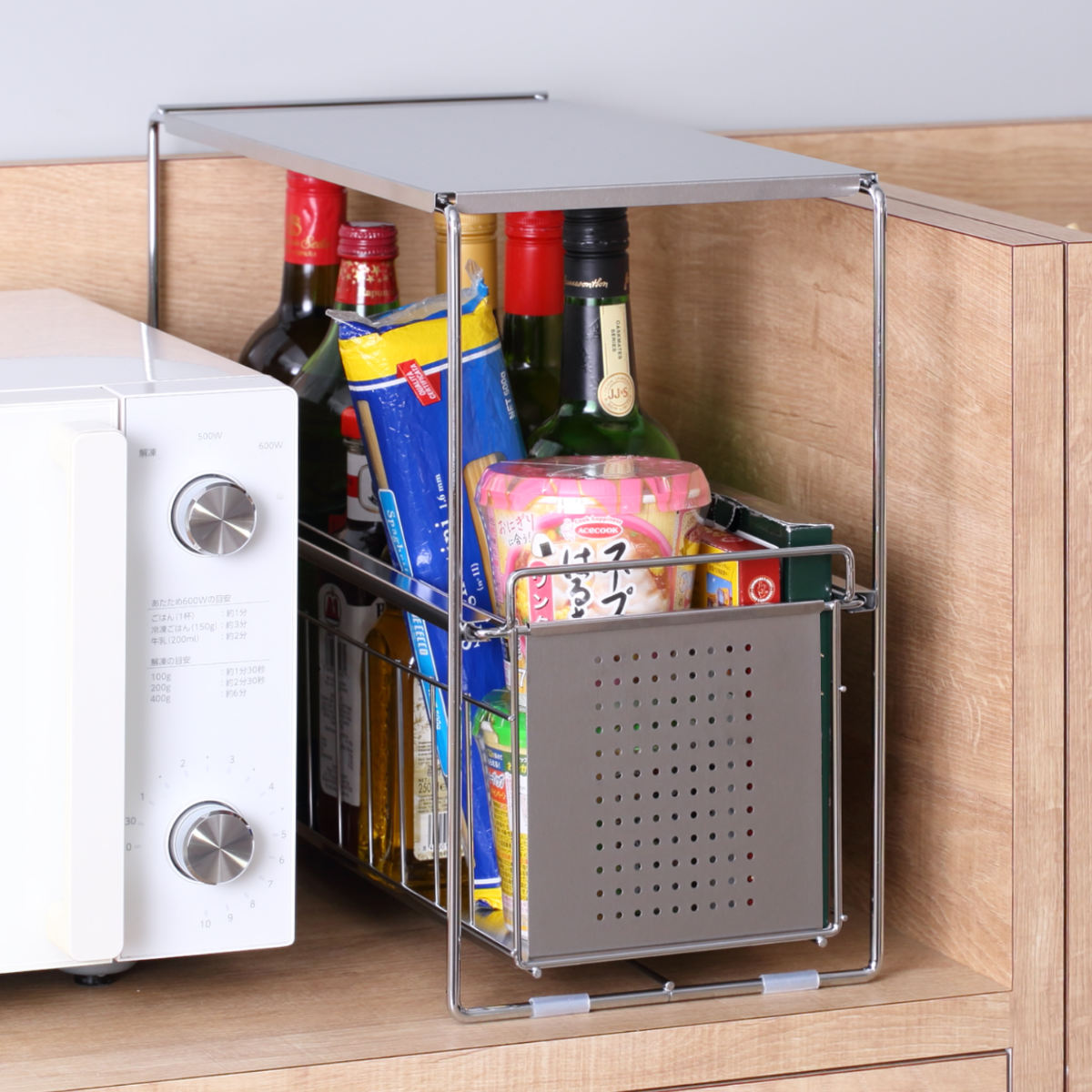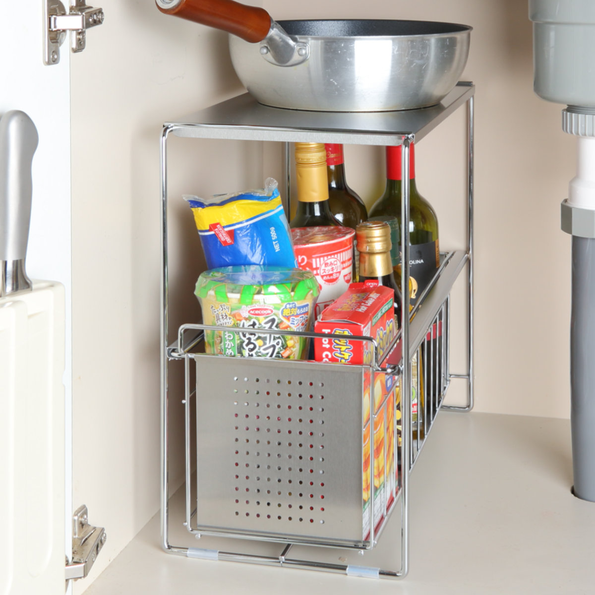 調味料や食品ストックなどで散らかりがちなシンク下をすっきり収納できるスライドラックです。抜群の収納力で背の高い醤油や油なども入れられます。シンクの下を占領していた調味料を整理することで、新たな収納スペースを確保することができます。