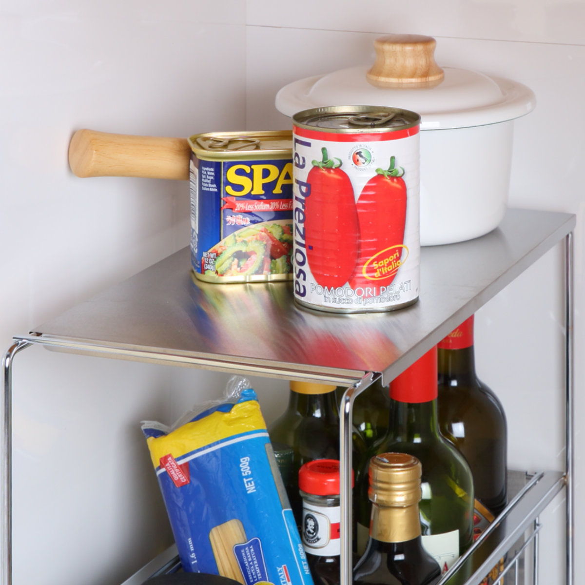幅のサイズ違い・段数違いで全6種類ご用意しております。組み合わせて使えば、高さが統一され天板が綺麗なフラットになるように設計されています。組み合わせ次第で天板に大きめのお鍋や小物を収納可能。より機能的にお使いいただけます。