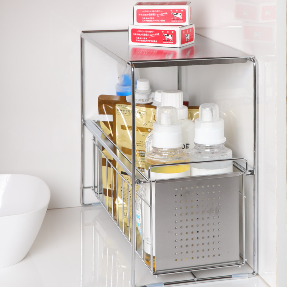 シンク下での使用はもちろん、洗面台の下の収納にも使えます。シャンプーや洗剤のストック、掃除道具など細々した物もスッキリと収納できます。