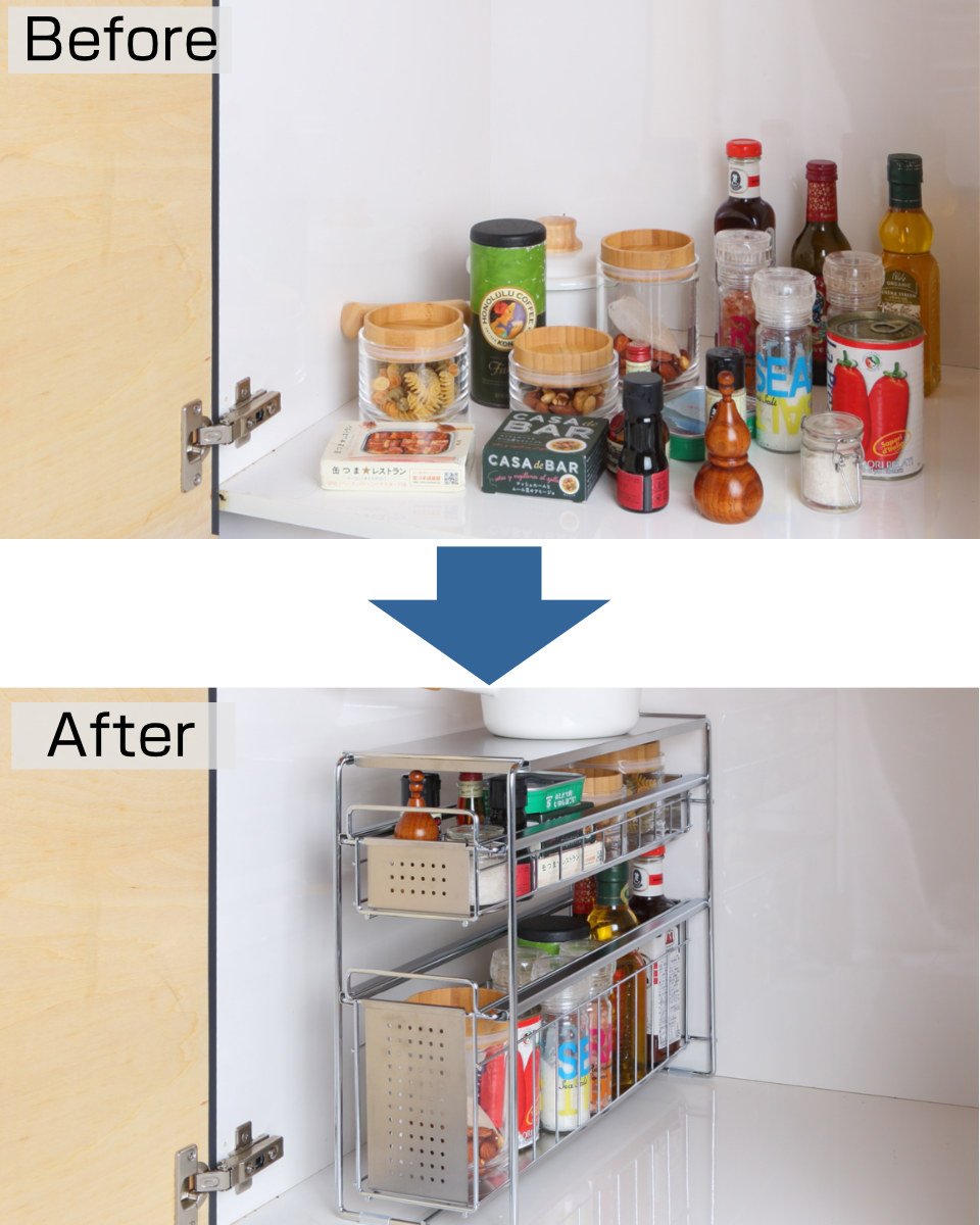 奥の方に収納した物も見つけやすく、サッと手に取れるスライド式。使い忘れて賞味期限が切れてしまったり、無駄に買い置きしてしまうことなく経済的です。