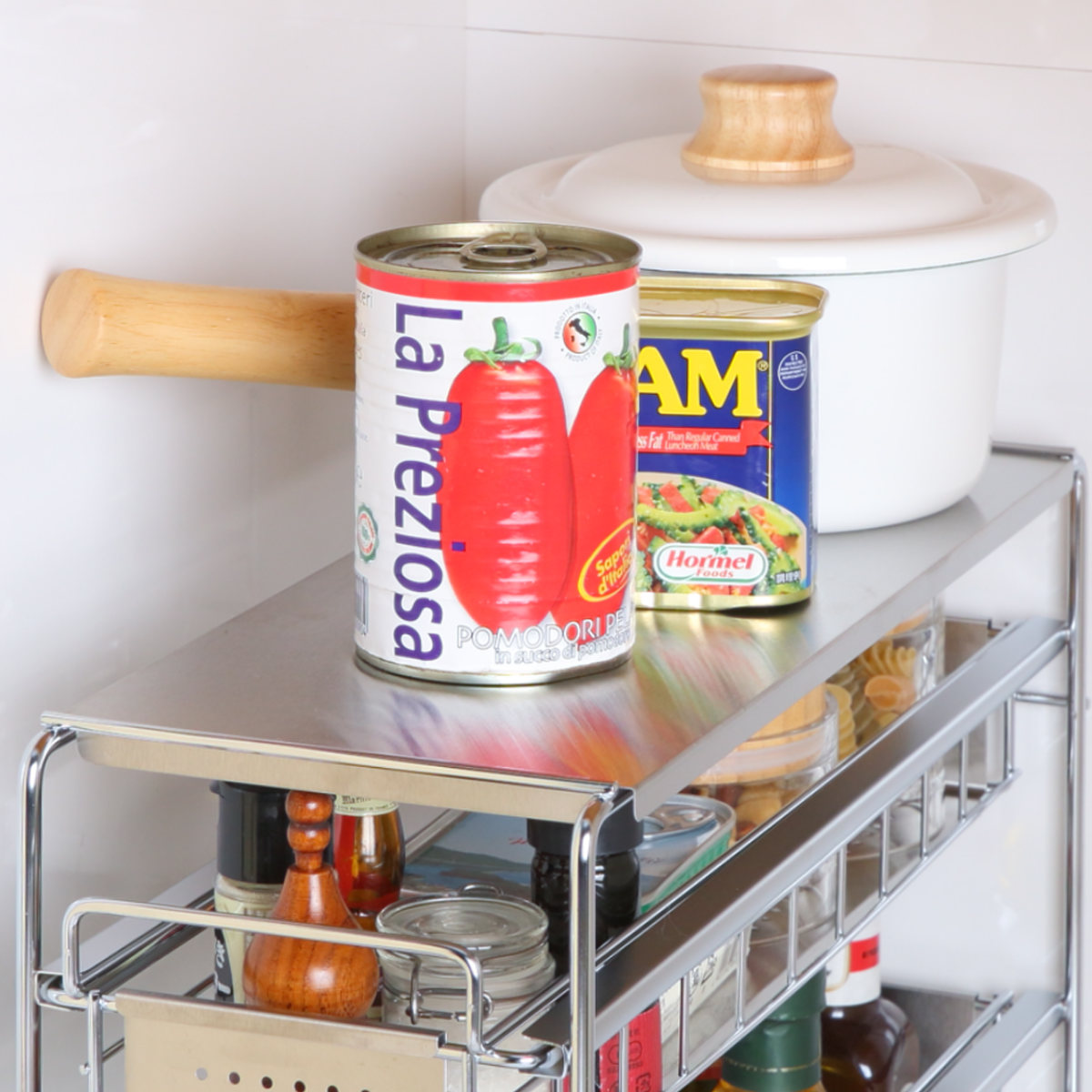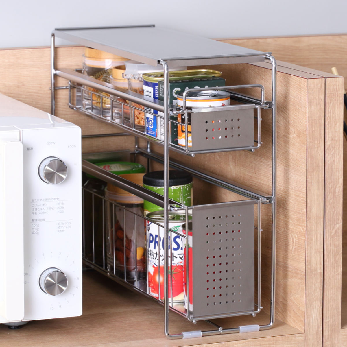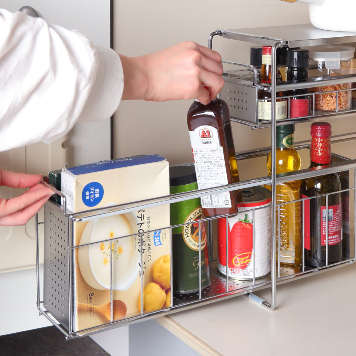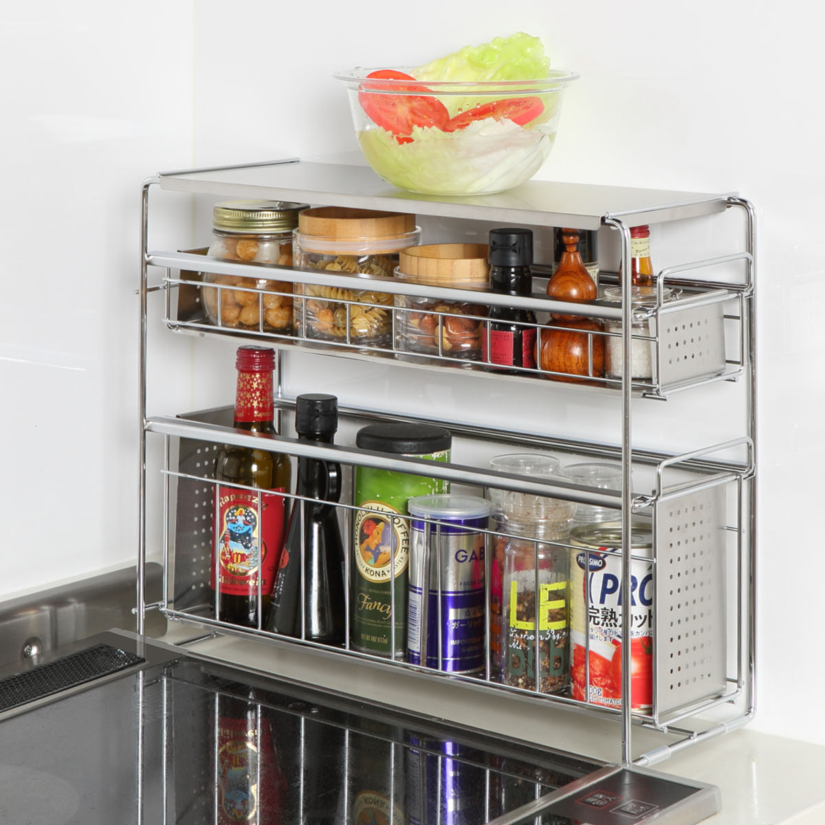 コンロ横のスペースに置いて調味料ラックとして使うのもおすすめ。調理中もサッと手に取ることができ、料理がはかどります。また、調理中の一時置きにも使えて便利です。