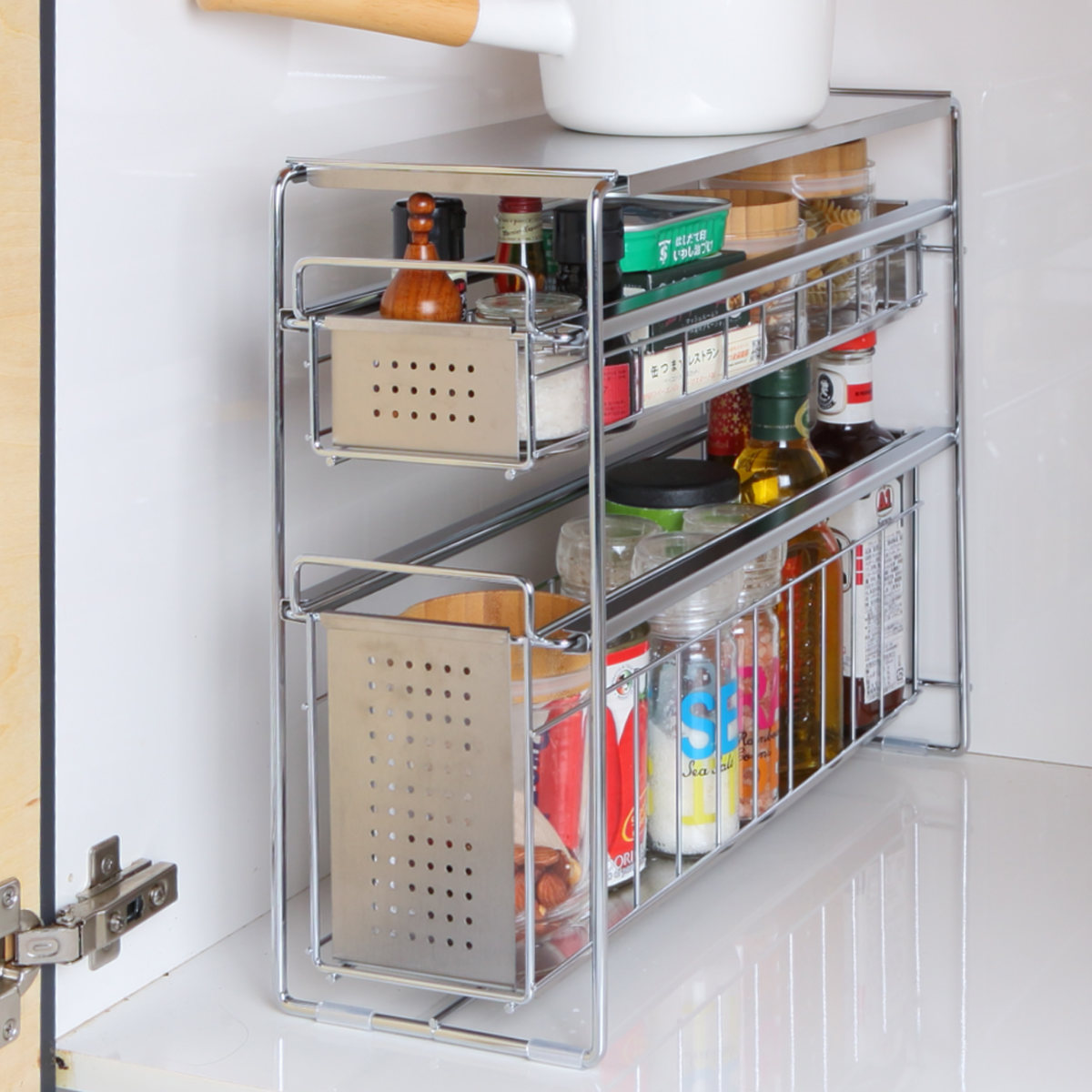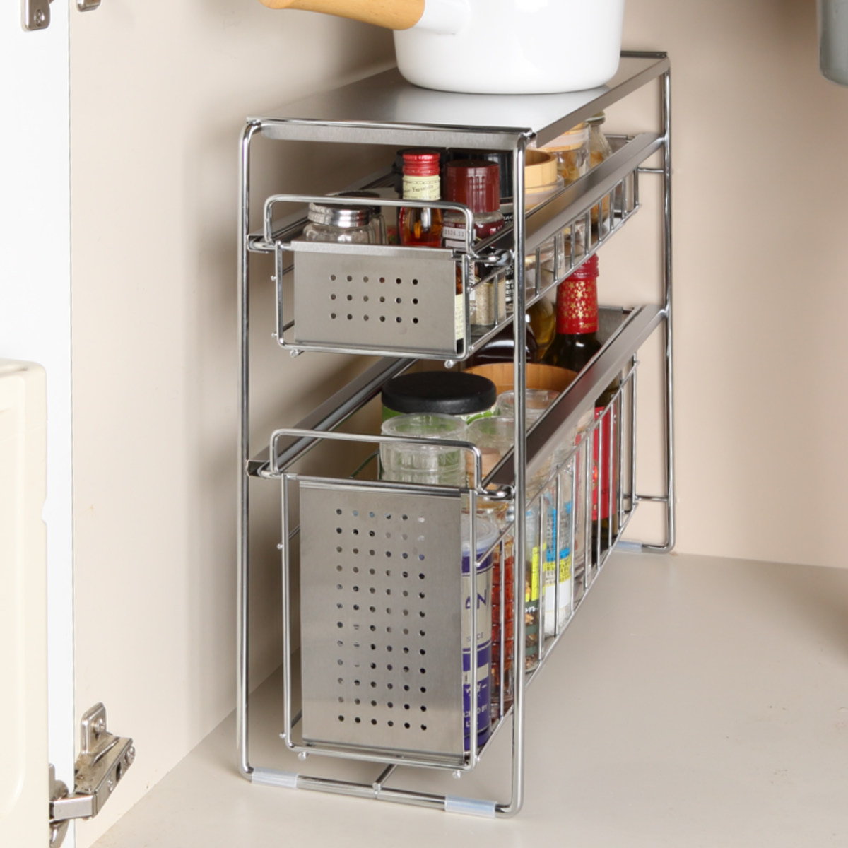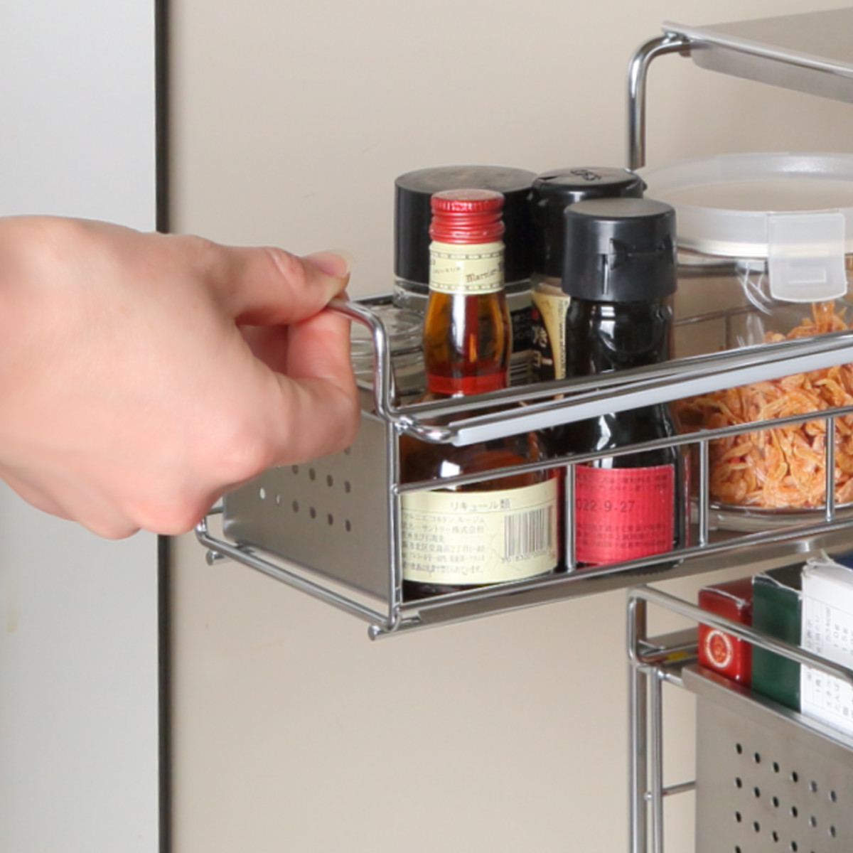 引き出しの底面はパンチング板なので、細いボトルや小さいスパイスなどもぐらつかずに安定して収納できます。