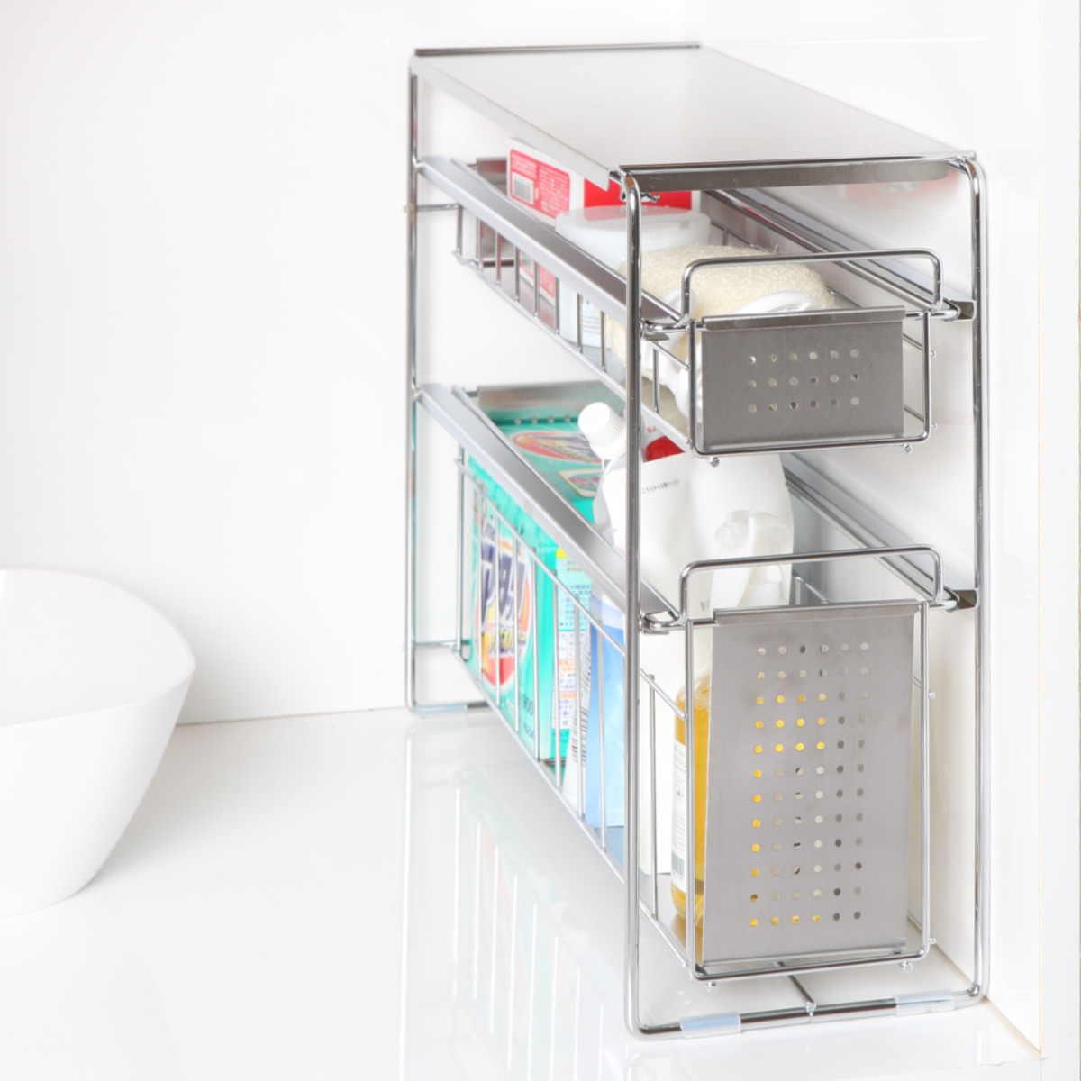 シンク下での使用はもちろん、洗面台の下の収納にも使えます。シャンプーや洗剤のストック、掃除道具など細々した物もスッキリと収納できます。