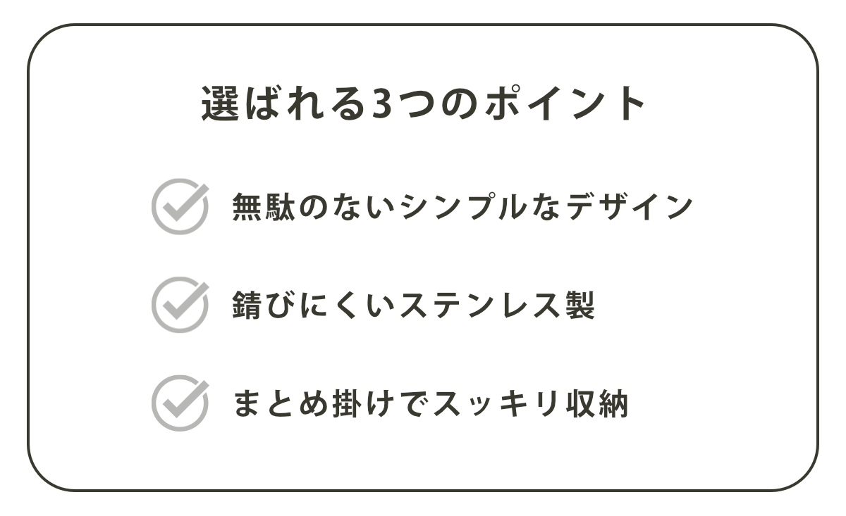 本体は耐久性に優れたステンレス製です。錆びにくく長持ちするため、洗面所やバスルームなど水まわりでも安心してお使いいただけます。