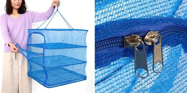 省スペースでたくさん乾燥できる3段タイプの干しかごです。保存食用にたっぷり野菜や魚を干したい方、大勢でのグループキャンプにオススメです。ヒモが付いているので吊るして干せるようになっています。