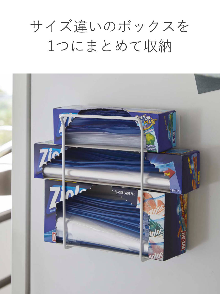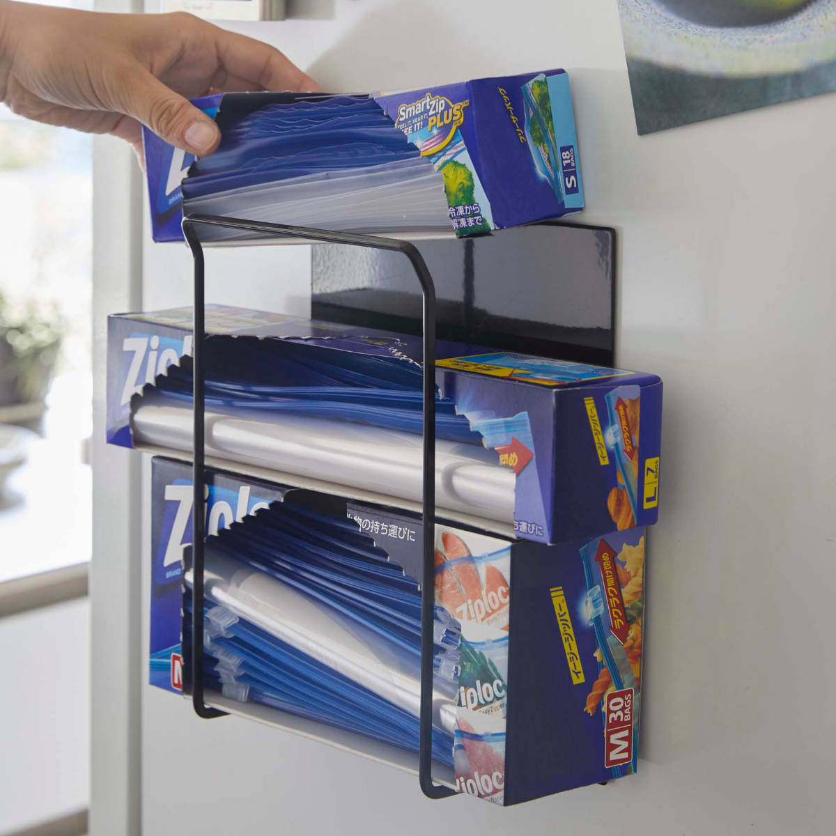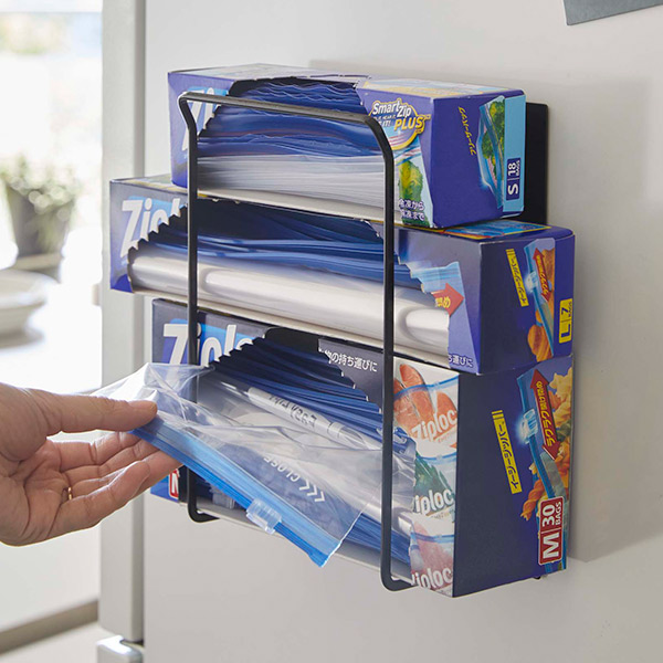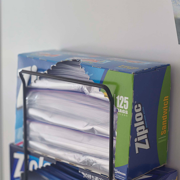 置き場所に困るフリーザーバッグを壁面を利用してすっきりとまとめて収納できるマグネットホルダーです。食品の保存には欠かせないフリーザーバッグはサイズ違いで常備しておきたいアイテム。大きさの違うフリーザーバッグも一括収納できて使いたい時にサッと取り出せるので、調理や片付けの時短に一役買います。