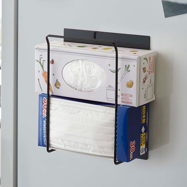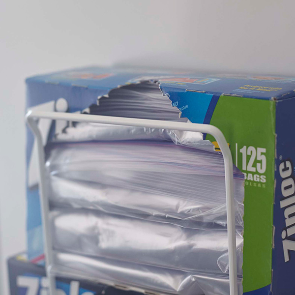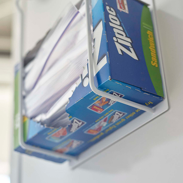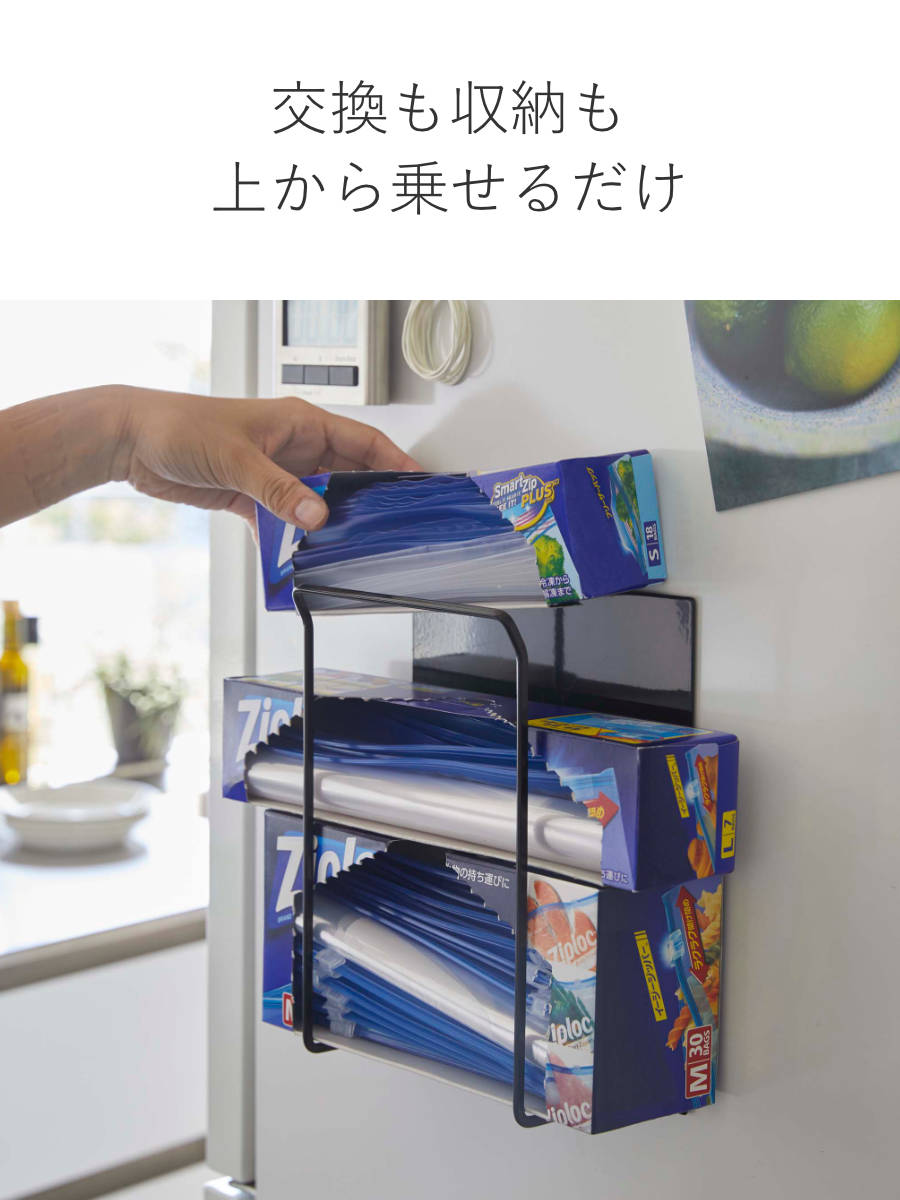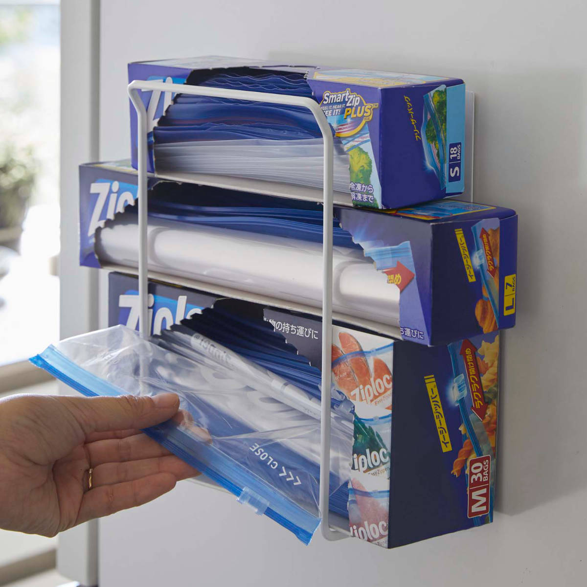 置き場所に困るフリーザーバッグを壁面を利用してすっきりとまとめて収納できるマグネットホルダーです。食品の保存には欠かせないフリーザーバッグはサイズ違いで常備しておきたいアイテム。大きさの違うフリーザーバッグも一括収納できて使いたい時にサッと取り出せるので、調理や片付けの時短に一役買います。