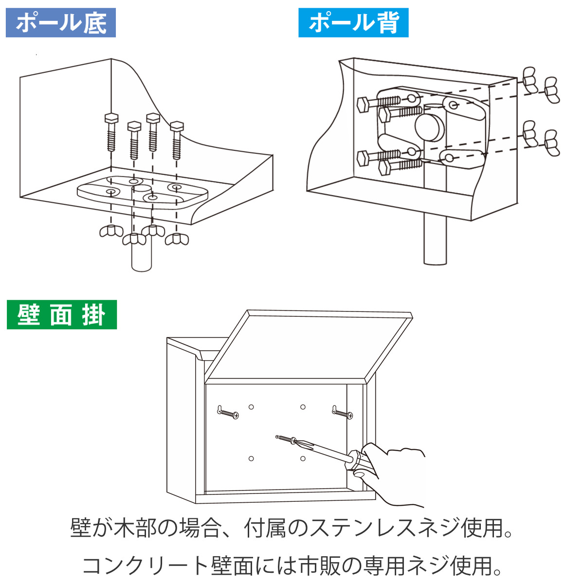 別売りのスタンドポールは、【ポール底】【ポール背】【壁面掛】への取り付けが可能です。