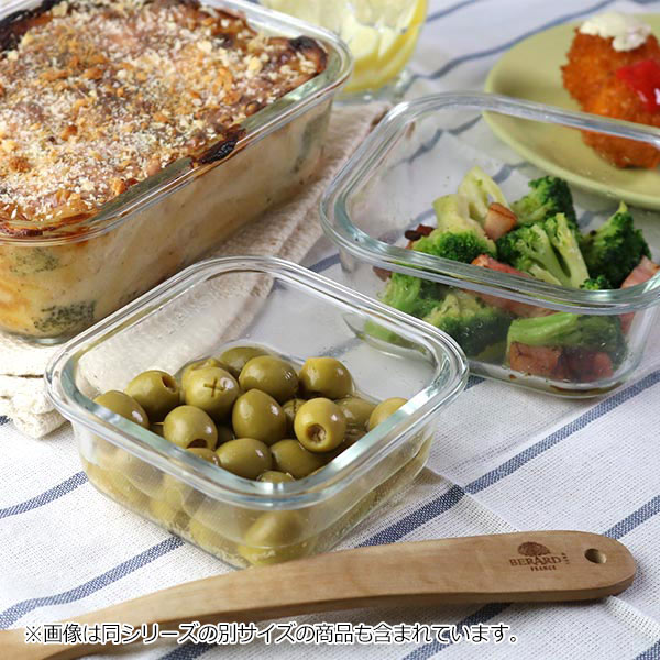 耐熱ガラス製の容量約500mlの角形保存容器です。お茶碗一杯半くらいのご飯の保存にぴったりな使い勝手のよいサイズです。