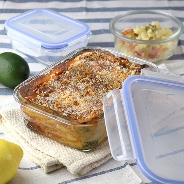 フタを外せば、電子レンジやオーブン調理も対応します。グラタンなどの温かい料理を冷蔵保存もできるので、食べたい時にそのまま「チンッ」することができます。(水気の多い料理類等、液体は冷蔵保存不可)