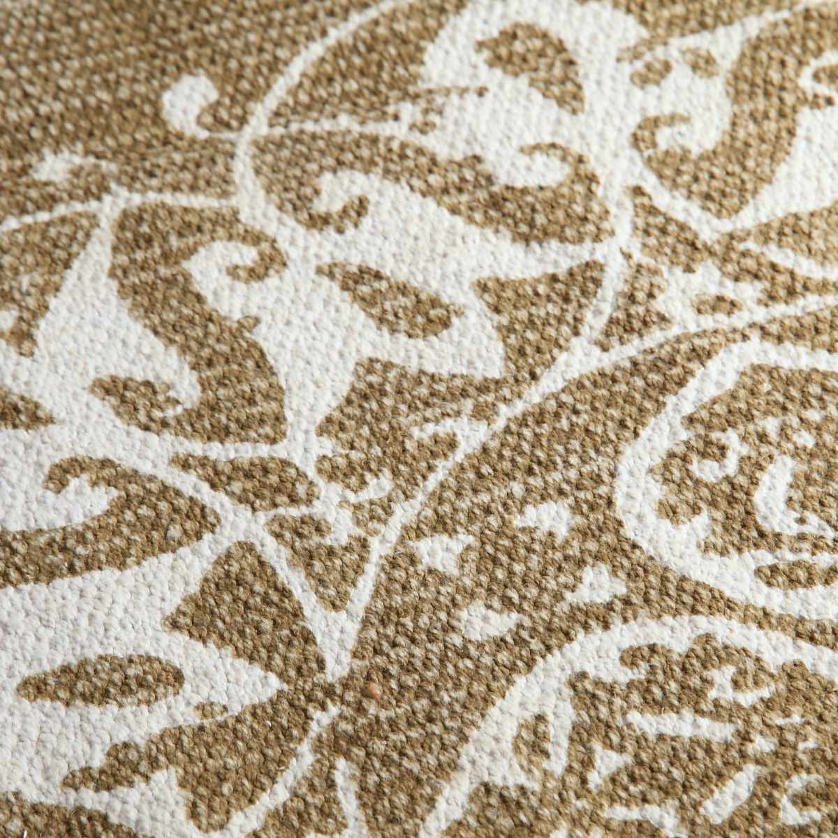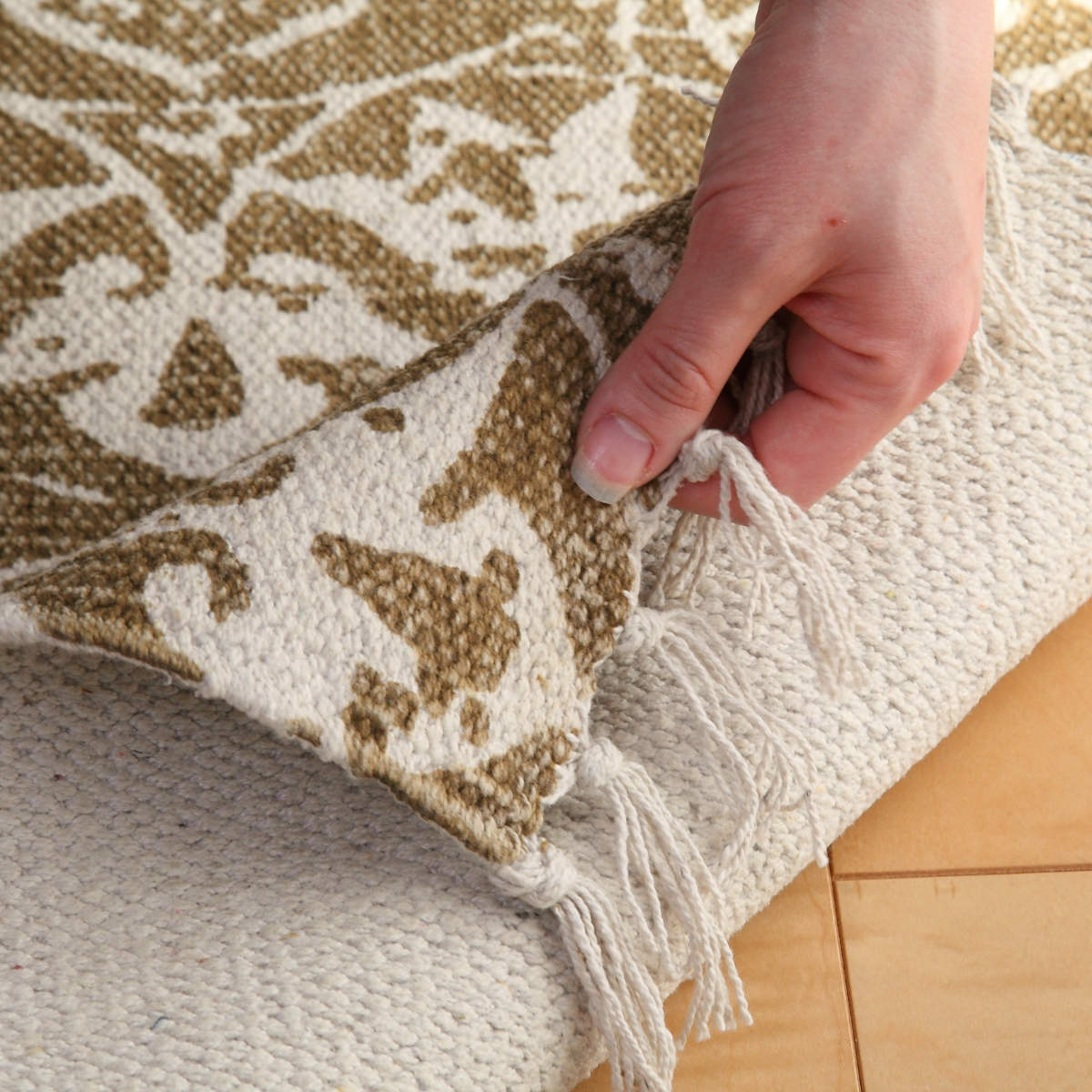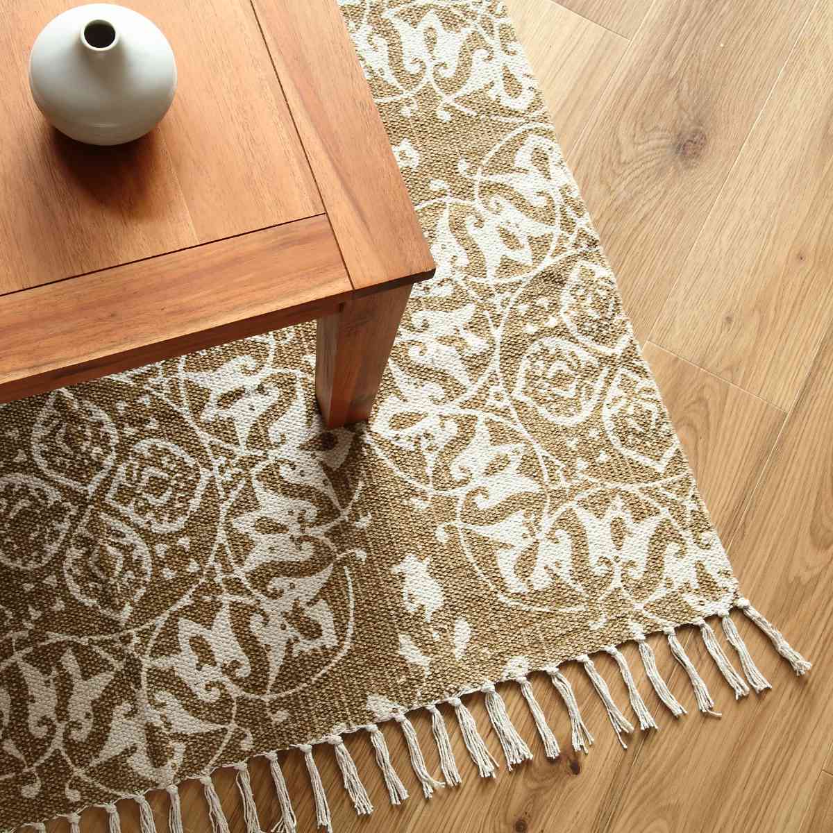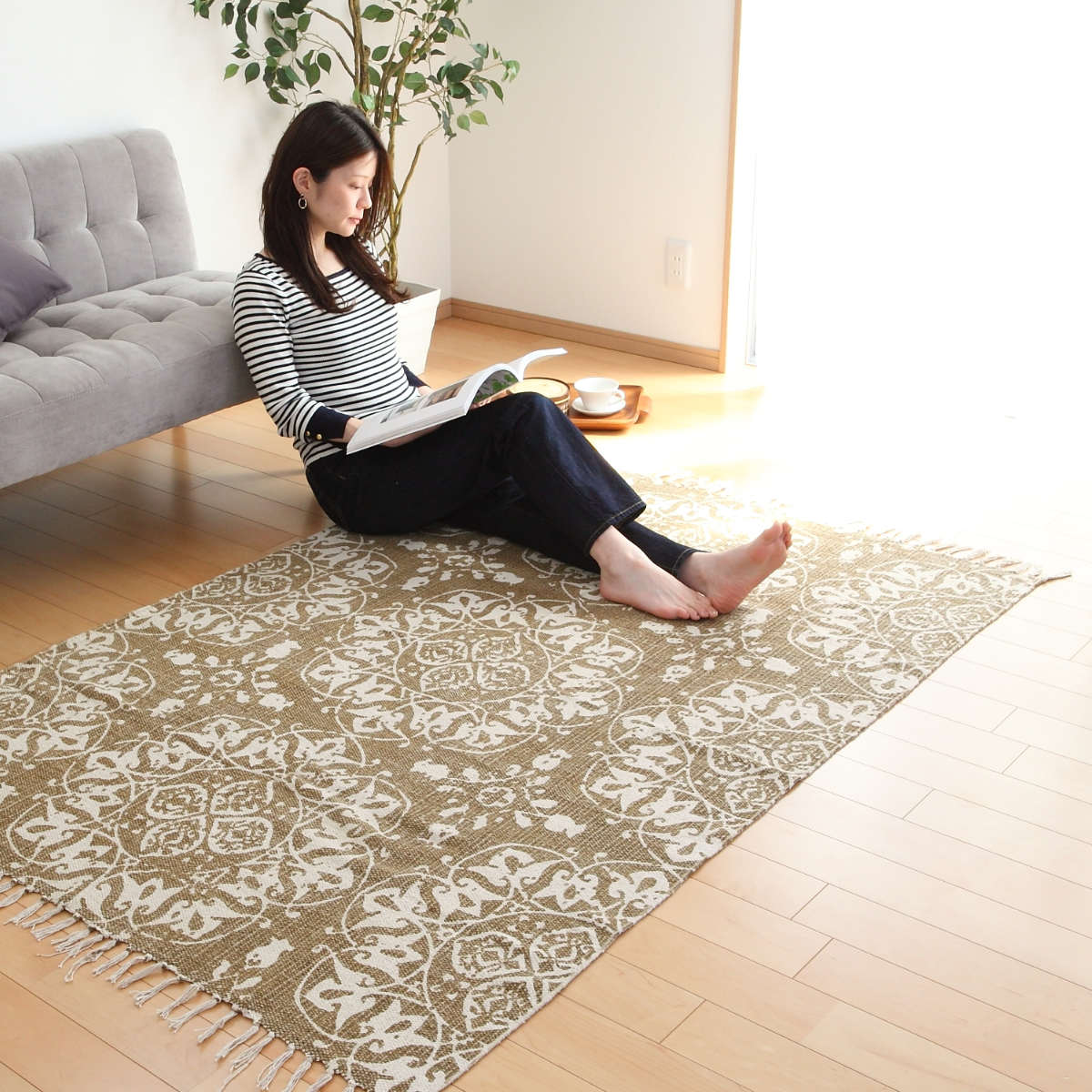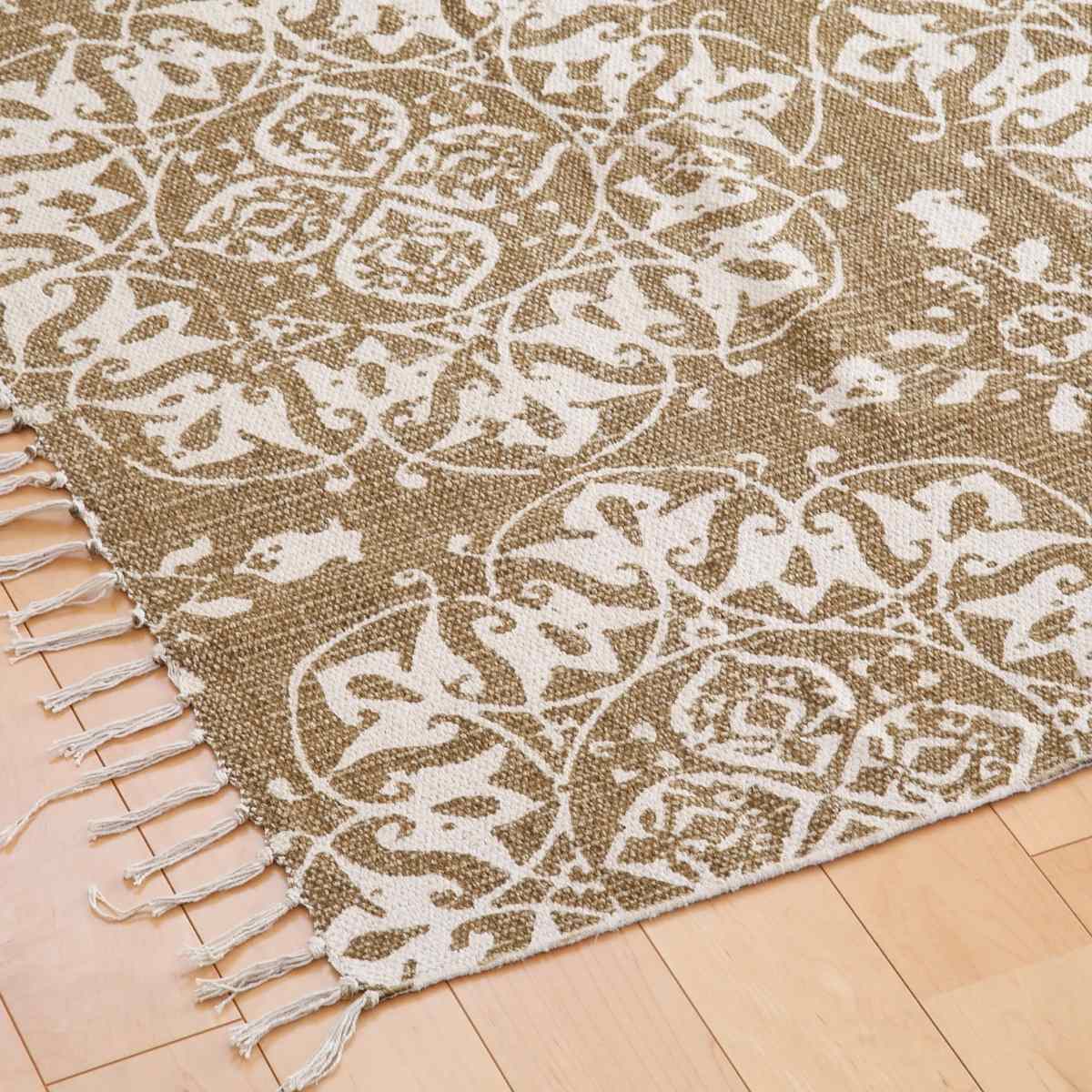インド製コットンで出来ているため、さらっとした肌触りが思わす素足で踏みたくなります。落ち着いた色合いで、洋室と和室のどちらのお部屋でもお使いいただけます。コットンで出来ているので楽に折りたたむことができ、移動させるときにも便利です。