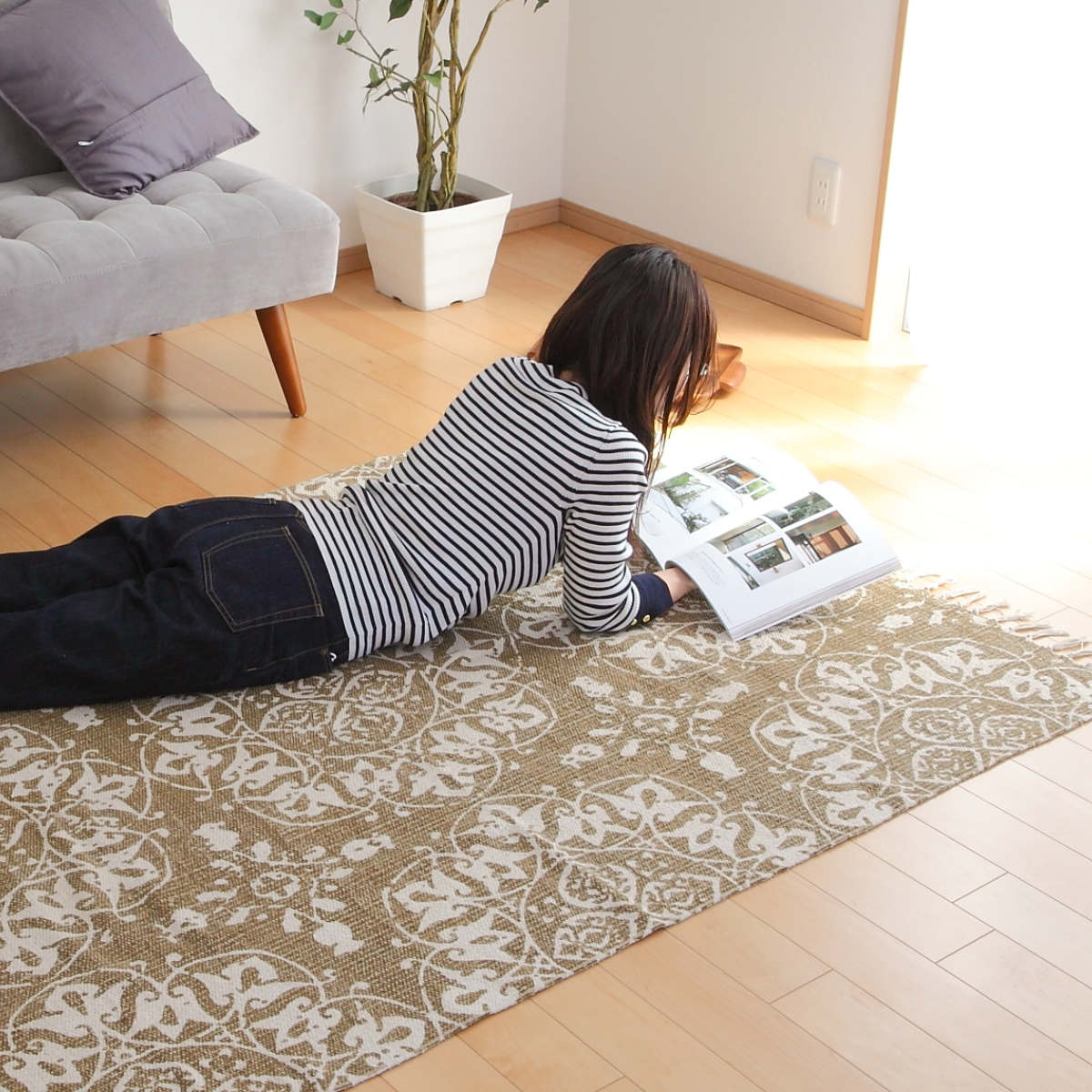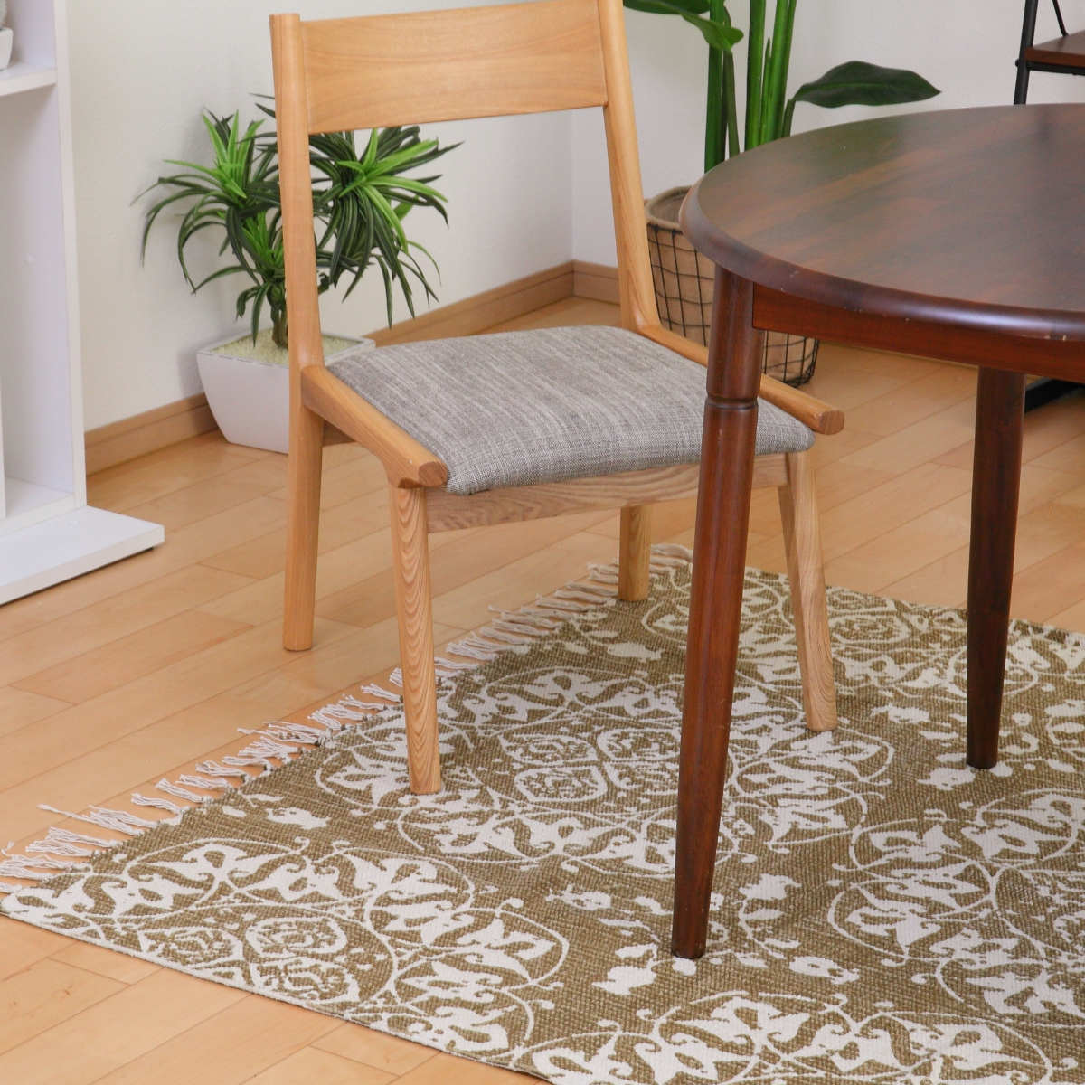 アジアンテイストなラグなので、敷くだけで存在感抜群です。存在感はあるのですが、色が落ち着いているので、フローリングにもよく合います。