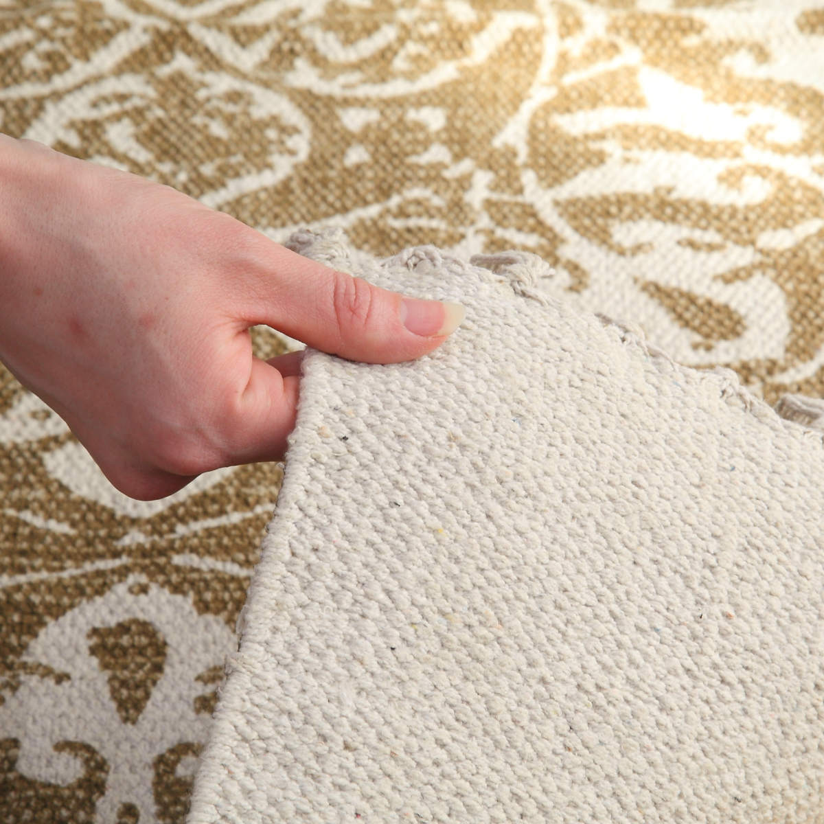 裏材にはすべり止め加工が施されています。フローリングの上でもラグがズレにくく、お掃除の際もストレスがありません。