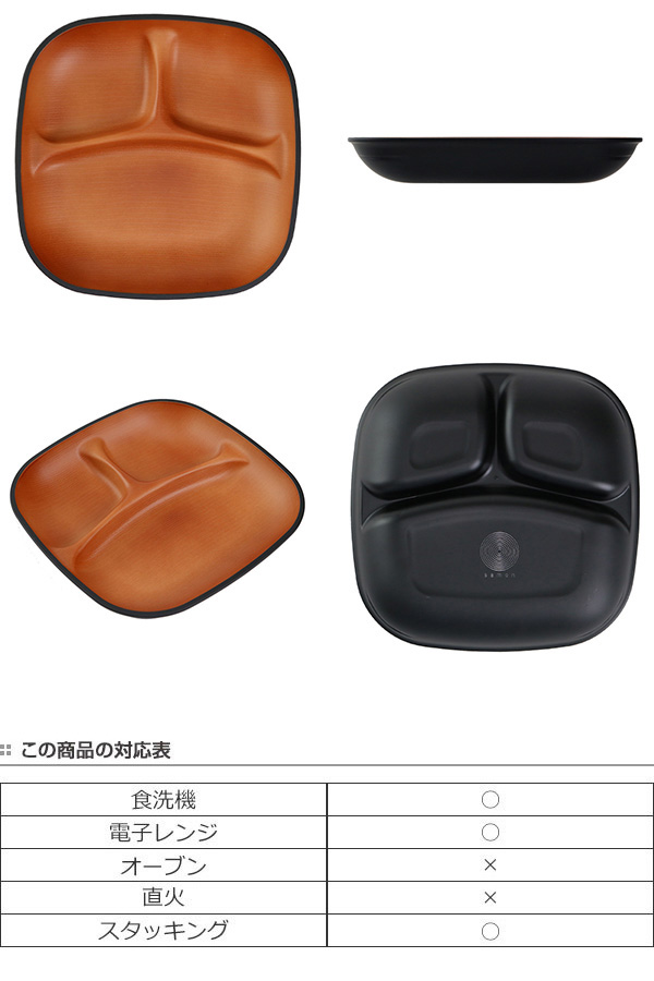 見た目は木製に見えるこちらの食器は、樹脂でできているので木製に比べて乾きが早くお手入れも簡単です。電子レンジ・食洗機どちらにも対応しています。