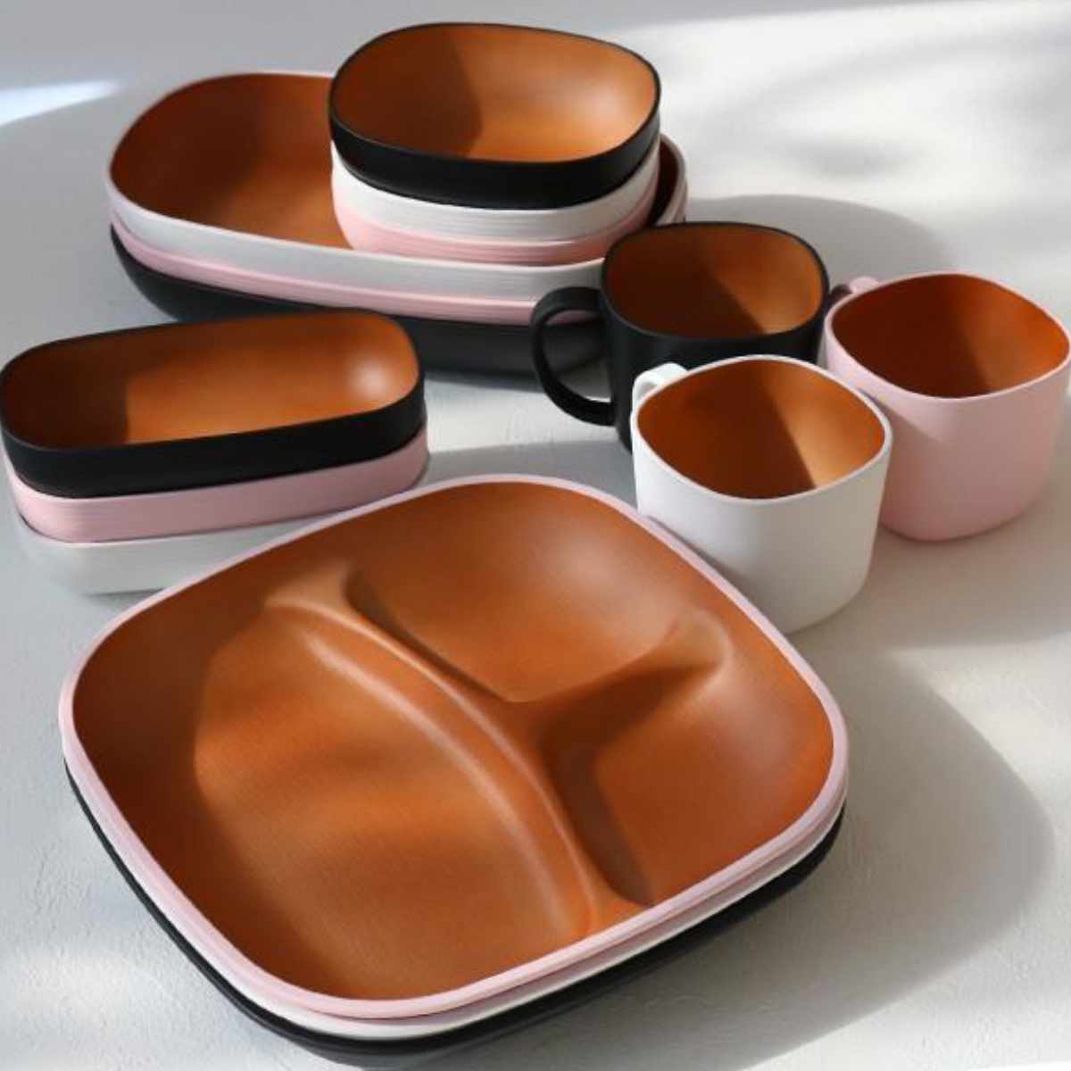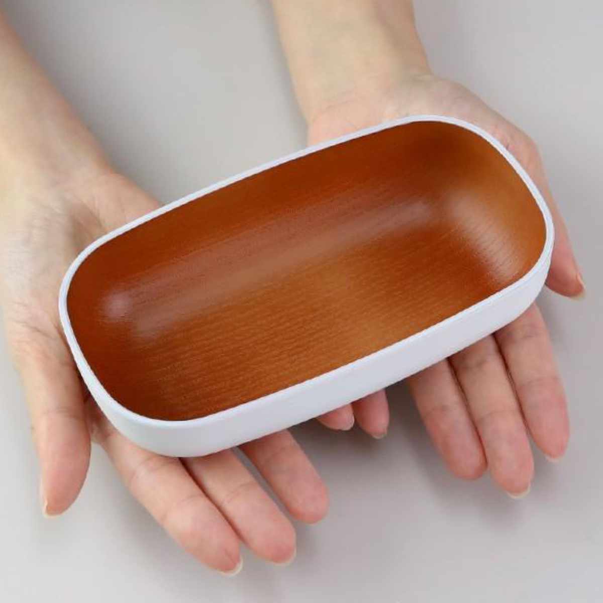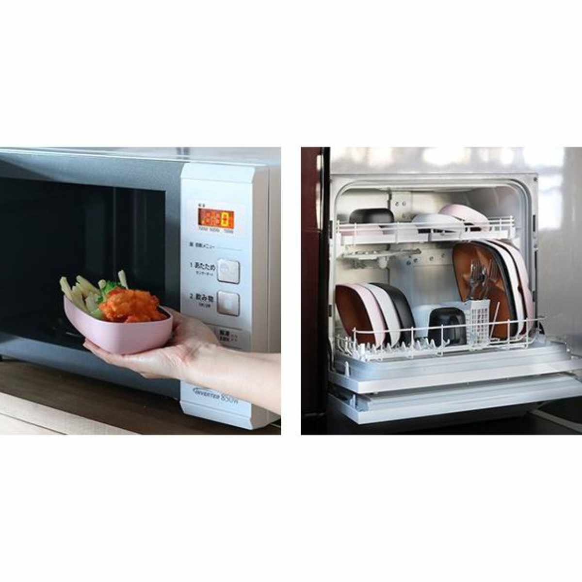 見た目は木製に見えるこちらの食器は、樹脂でできているので木製に比べて乾きが早くお手入れも簡単です。電子レンジ・食洗機どちらにも対応しています。