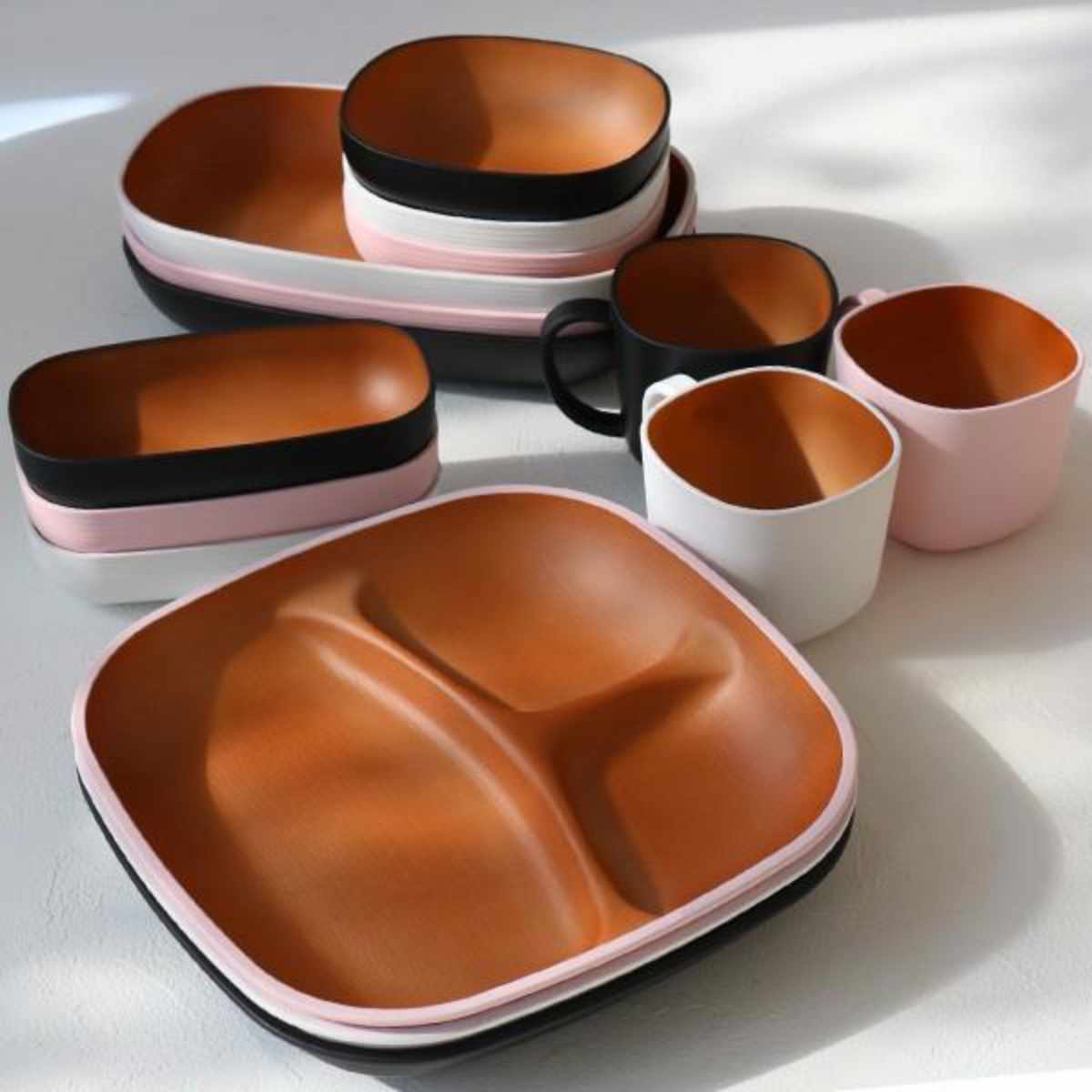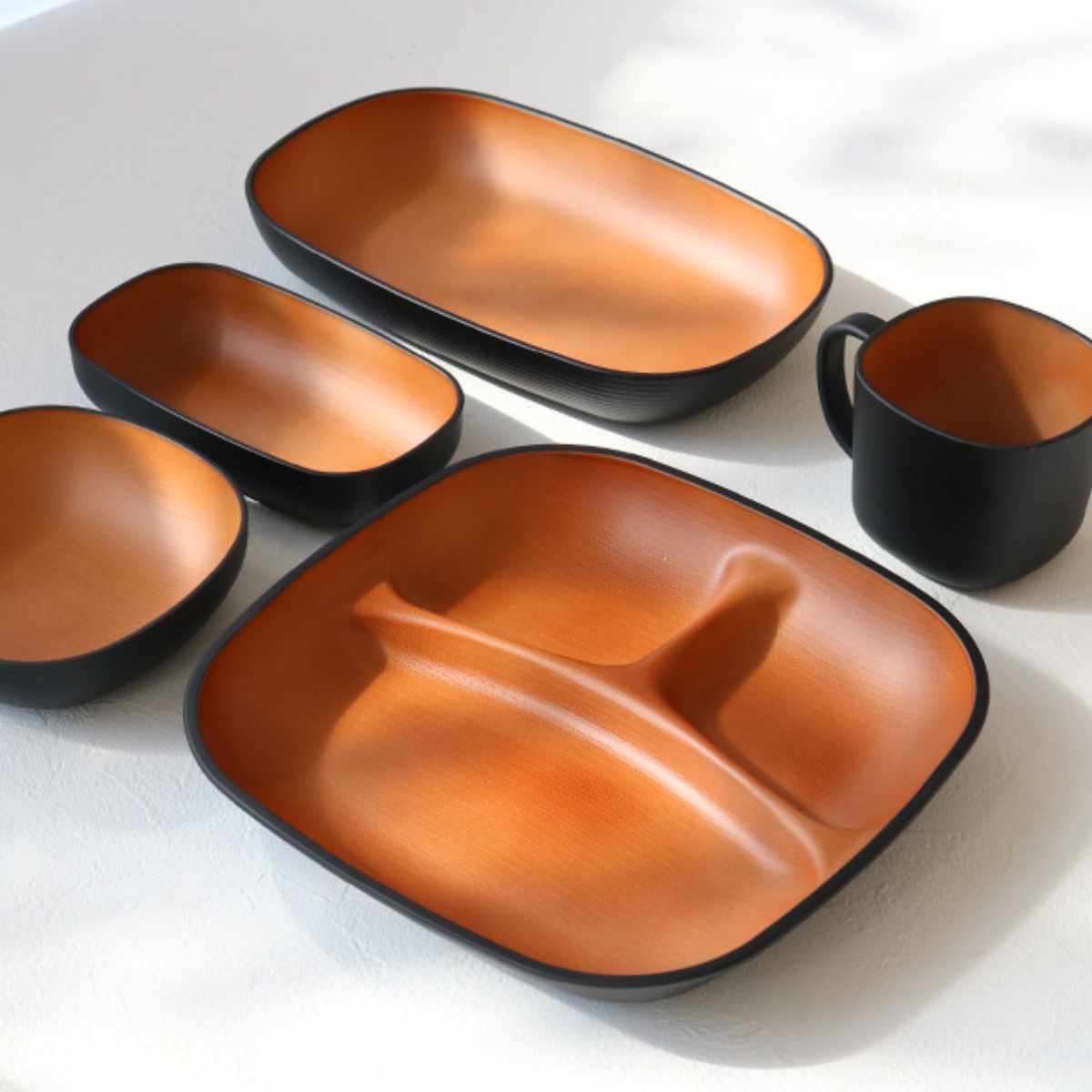 見た目は木製に見えるこちらの食器は、樹脂でできているので木製に比べて乾きが早くお手入れも簡単です。電子レンジ・食洗機どちらにも対応しています。