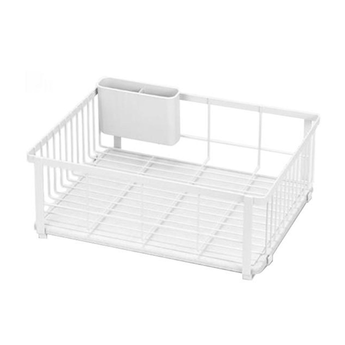 すとんとしたシンプルでかわいい角型のフォルムが特徴的な水切りバスケットです。仕切りやスタンドなどない、シンプルなスチールフレームだからお皿の形やサイズを選ばず、家族の夕食分の食器類やカトラリーまで効率的に片付けられます。また、場所をとるフライパンや鍋なども置きやすく、使い勝手が良いです。