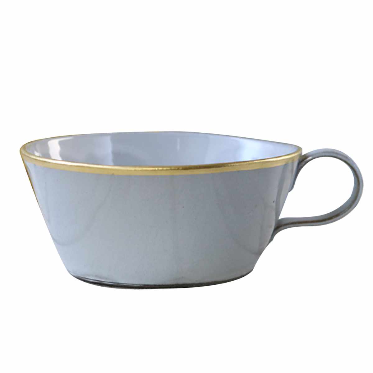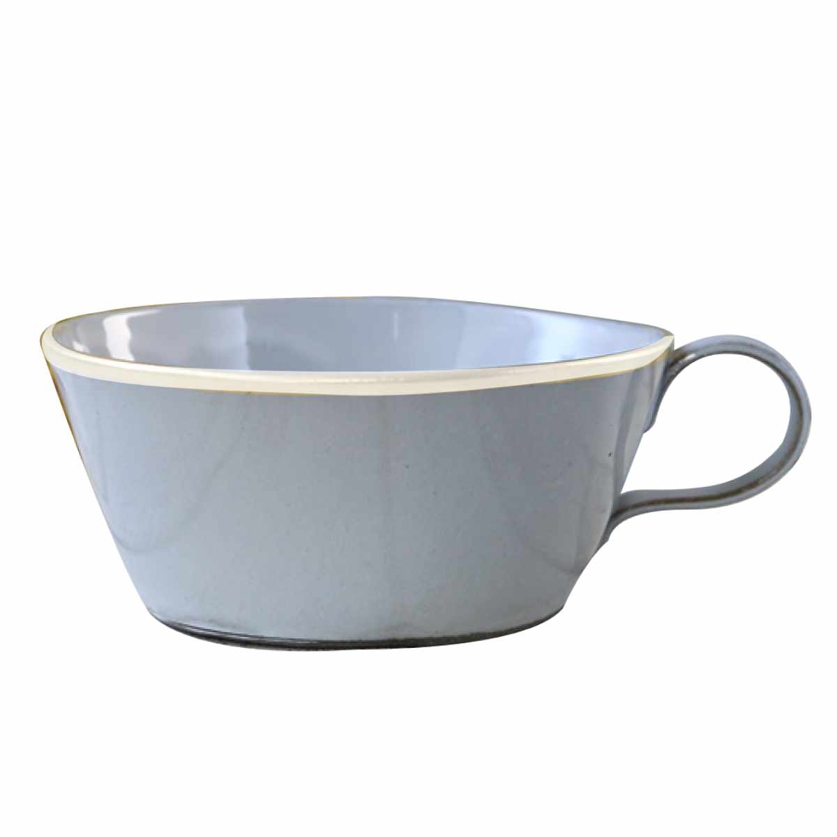 優しいペールグレーに、アクセントとなる縁取りが美しいスープマグです。口が広くすくいやすいので、具沢山のスープやポトフなどにも最適です。スープだけでなく、朝食のシリアルや一人分のサラダにもぴったりの使いやすいサイズです。均一ではないリム(ふち)と上品な色味がお料理の色をより一層引き立てます。