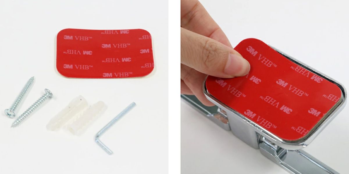 付属のプラグとネジで壁にしっかり固定できます。壁に穴を開けられない場所でも、付属の3M社製両面テープで簡単に取り付け可能です。