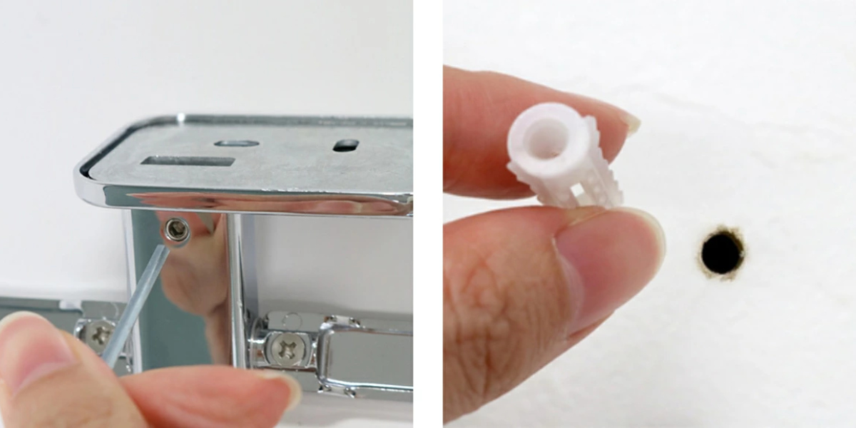 | ■アンカープラグとネジを使用■ (1)六角レンチを使ってビスを外し、受け用の部品を取り出します。 | (2)壁に穴を開け、アンカープラグを取り付けます。 |