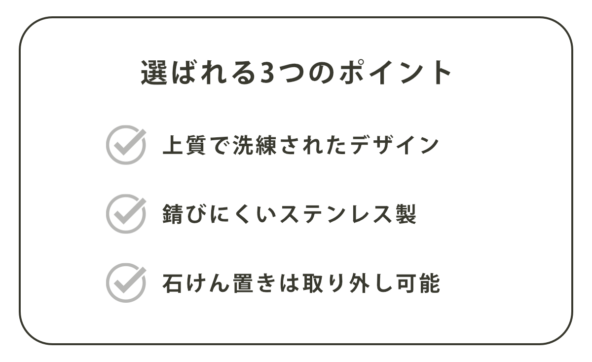 本体は耐久性に優れたステンレス製です。錆びにくく長持ちするため、洗面所やバスルームなど水まわりでも安心してお使いいただけます。