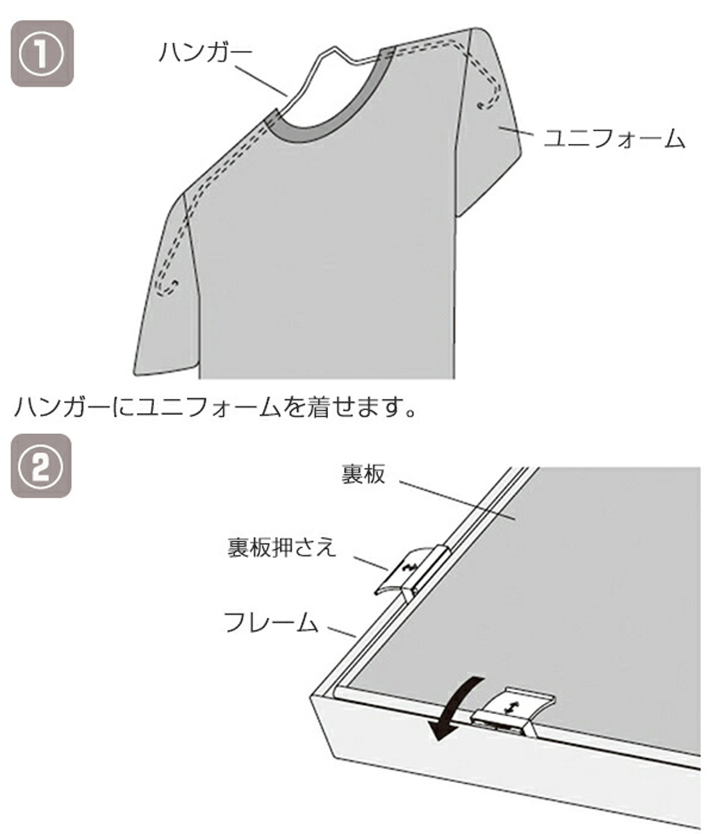 タンスに眠っている大好きな選手のユニフォームや、アーティストのTシャツ、お子様が部活で使っていたものなどを記念に飾ってみませんか?専用ハンガー付きで、袖を広げた状態をキープできます。