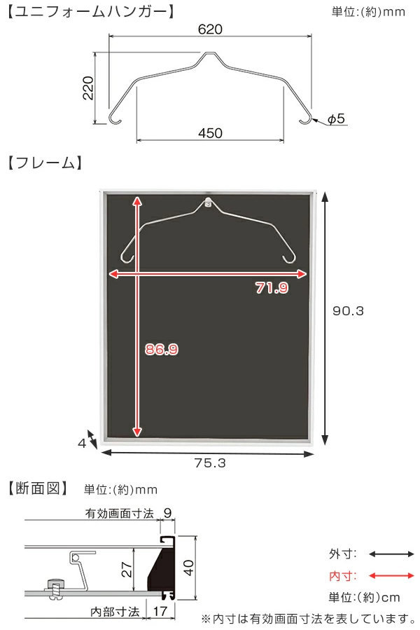 お部屋に馴染みやすいシンプルなスリムフレームです。専用ハンガー付きで簡単に設置できるので、タンスに眠っている好きな選手のユニフォームや、お子様が部活で使っていたものなどを記念に飾ってみませんか?スポーツ好きの人へのプレゼントとしてもおすすめです。