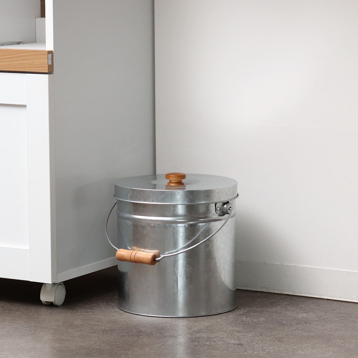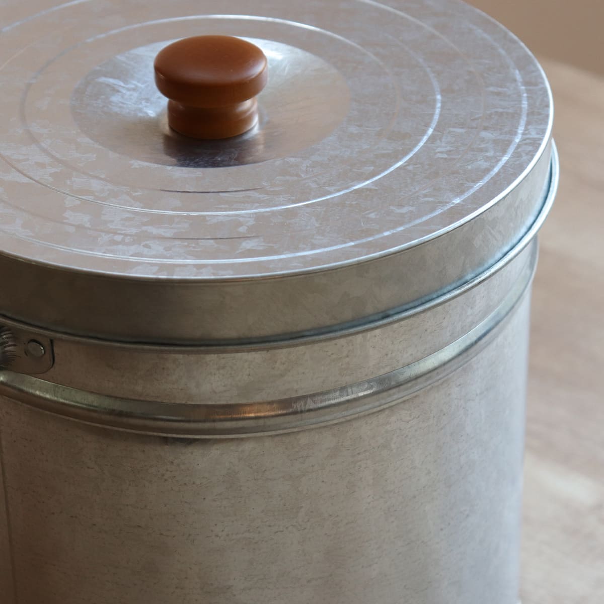 | 材質 | 本体・フタ・底材質:亜鉛メッキ鋼板(花柄トタン) つまみ(フタ):木製 取手にぎり:木製 ツル:鉄線 金具:鉄板 |