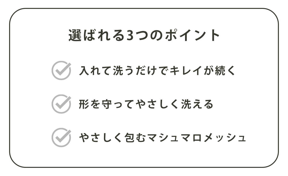 柔らかく厚みのある立体メッシュが、デリケートな衣類をやさしく保護します。通気性がよく水流もスムーズに通るため、すっきり洗い上がります。