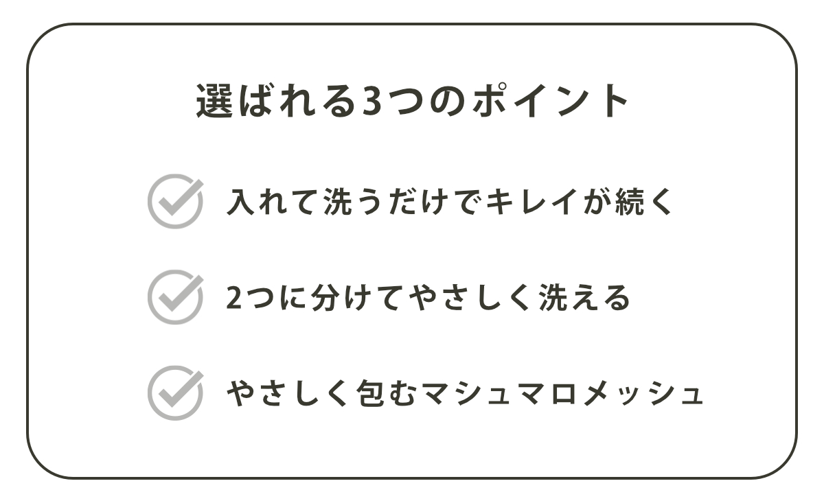 柔らかく厚みのある立体メッシュが、デリケートな衣類をやさしく保護します。通気性がよく水流もスムーズに通るため、すっきり洗い上がります。