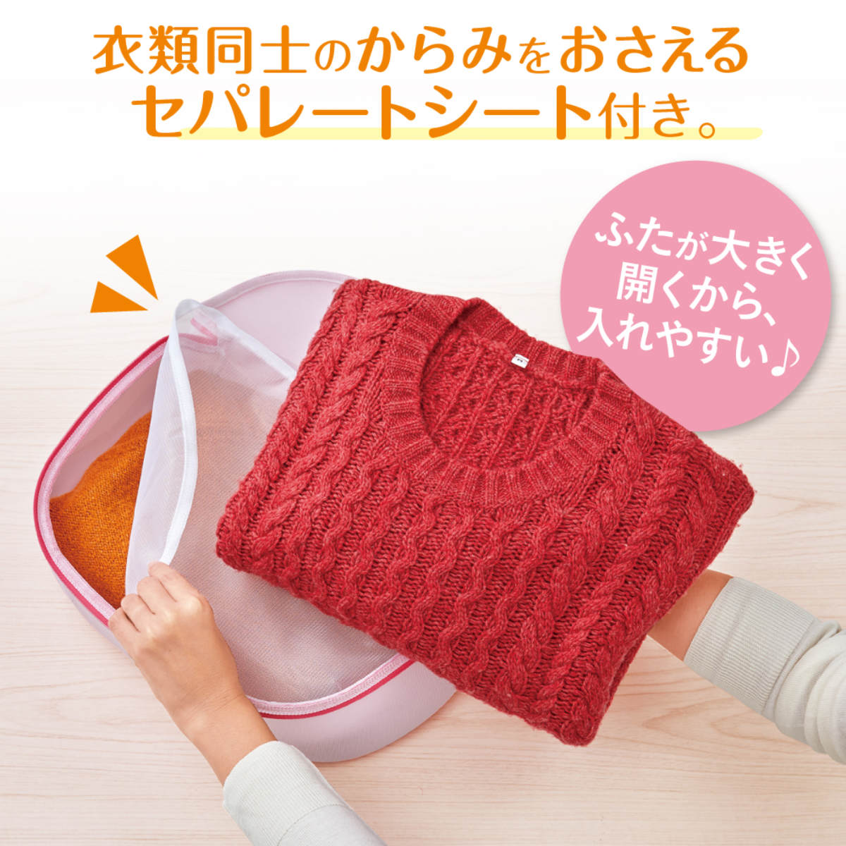 2着を分けて入れられる設計で、デリケートな素材も安心してお手入れできます。セパレートシート付きなので、ネット内の衣類同士が絡まるのを防ぎ、摩擦や型くずれをおさえながらやさしく洗えます。