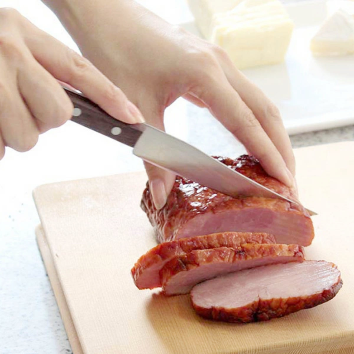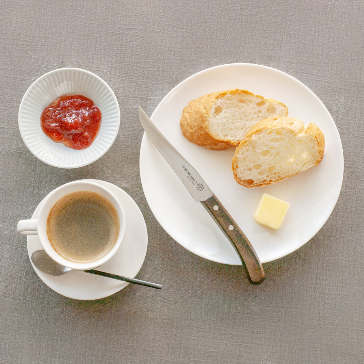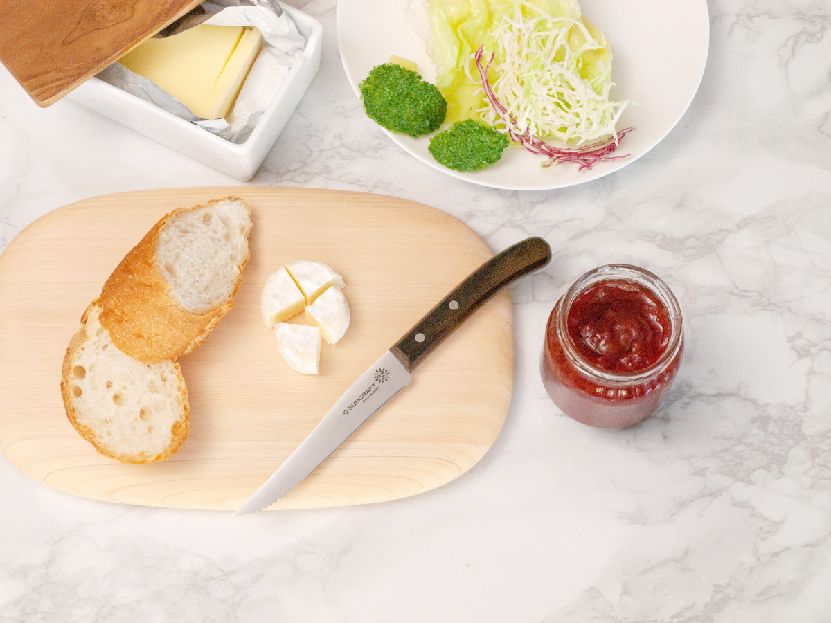 コンパクトサイズのパン切り包丁とがった刃先とギザギザの波刃で、食材に刃がスッと入るパン切り包丁です。ペティナイフくらいのサイズ感で、ハムやチーズをちょっと切り分けたい時にも便利です。