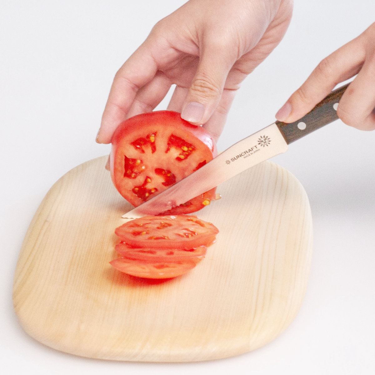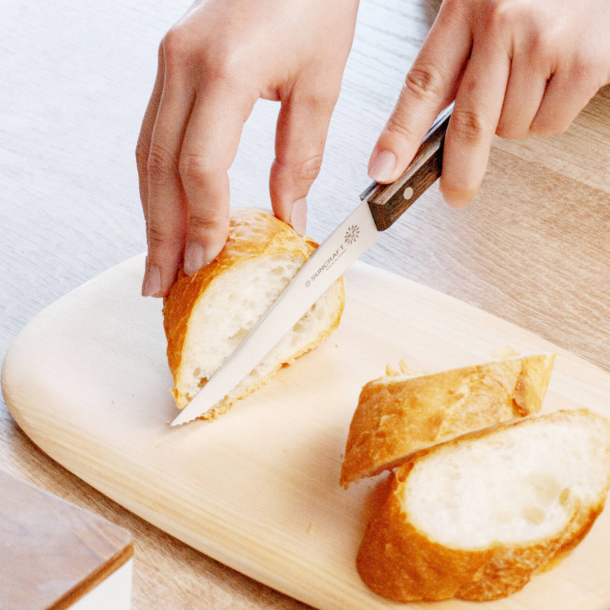 とがった刃先は、筋のある肉料理にも使用できます。波刃の部分は、表面が固いハード系のパン、チーズ、フルーツのカットから、ロールケーキや熟したトマトなど、柔らかい食材もつぶさず、細かい波刃が食材を確実に捉えるのでしっかり切れます。