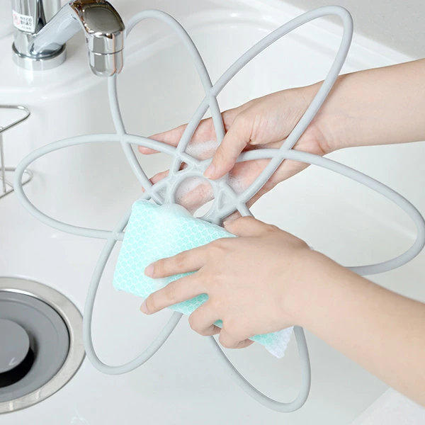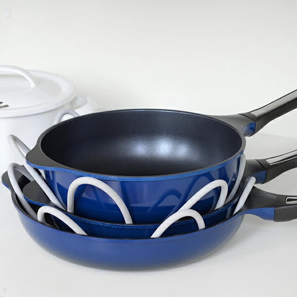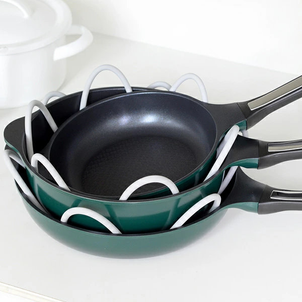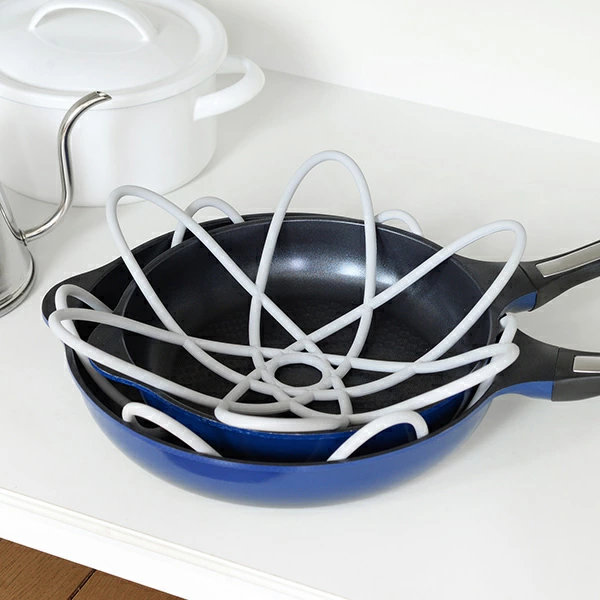 ●柔らかいシリコーンゴム製で、フライパンやお鍋を重ねて収納しても、優しく包み込んでキズつきから守ってくれます。