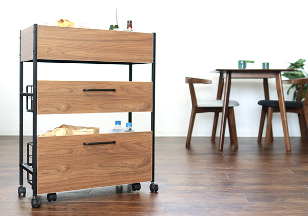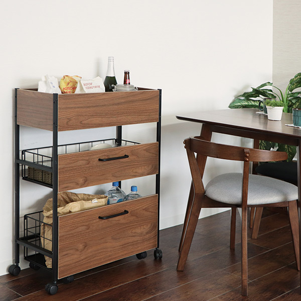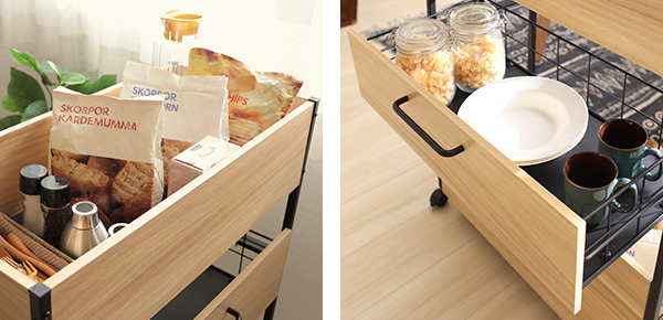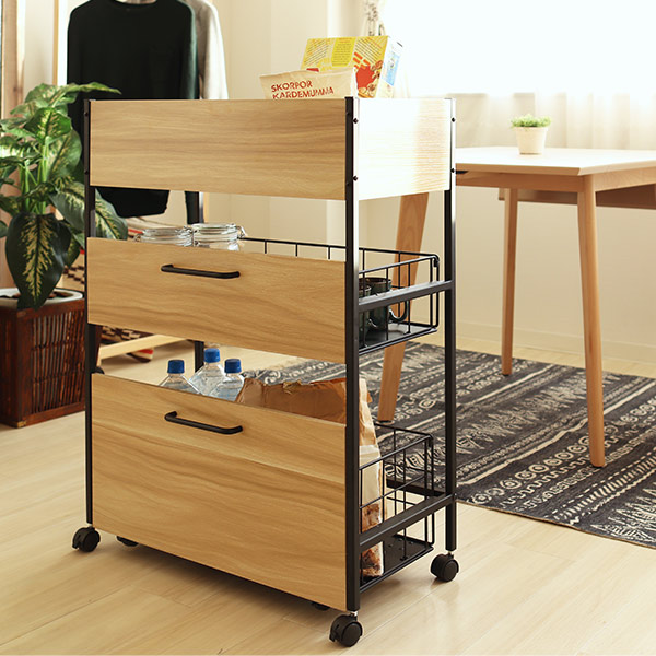 オープンスペースと2段の引出しを組み合わせた、収納力抜群のワゴンです。キャスター付きで移動もラクラク♪キッチンやデスク脇、リビングなど、お好きな場所にサッと移動して便利にお使いいただけます。