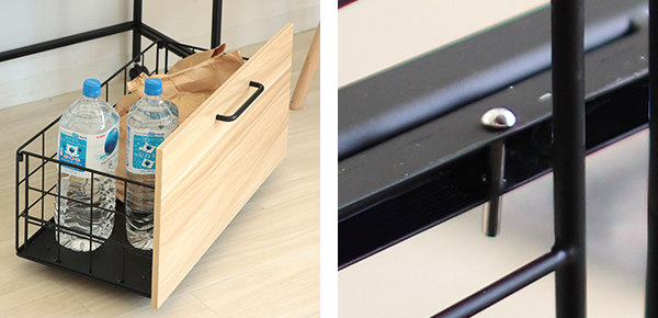 | 下段引出し キャスターラック仕様なので、本体から取り外して、単体で移動させることも可能です。2Lのペットボトルも収納できます。 | ストッパー付き 中段、下段は引出しが本体から抜け落ちないようにストッパーが付いているので安全にお使いいただけます。 |
