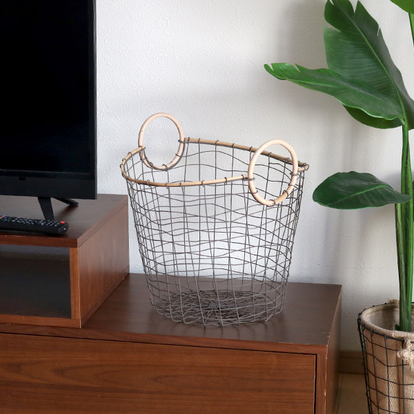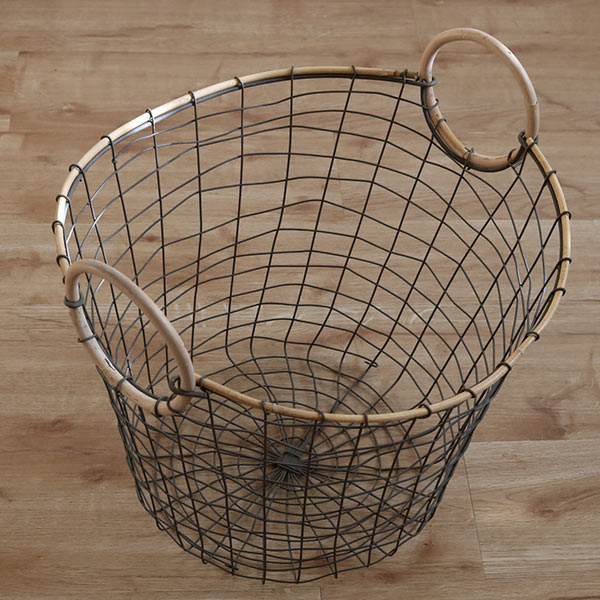 ランダムに張られた表情豊かなワイヤーと、やさしい印象のラタンの異素材を組み合わせたバスケットです。無機質のなかに天然素材の温かさを感じるデザインです。