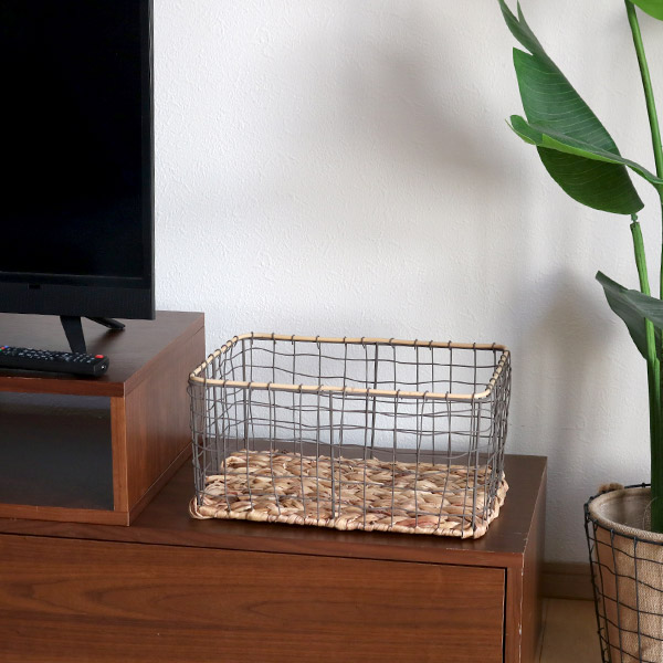ランダムに張られた表情豊かなワイヤーと、やさしい印象のラタンとウォーターヒヤシンスの異素材を組み合わせたバスケットです。無機質のなかに天然素材の温かさを感じるデザインです。