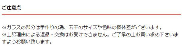 | 注意事項 | ※耐熱ガラスではございませんので、沸騰したてのお湯はご使用いただけません。 ※急激な衝撃・温度変化を与えないでください。 |