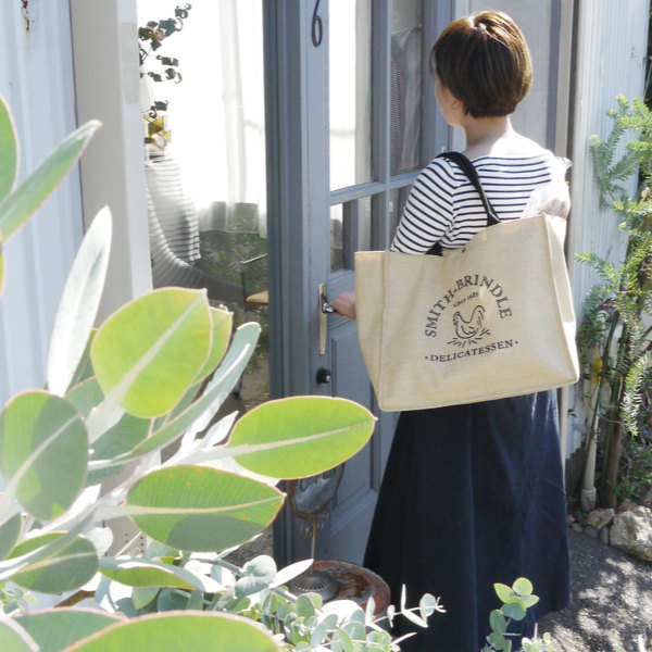 イギリスの片田舎にある小さなデリのお店をイメージして作られた、素朴なジュート(麻)風のバッグです。ポリエステル製なので、お手入れ簡単。天然素材の商品にありがちな、肌が触れたところのチクチク感がありません。