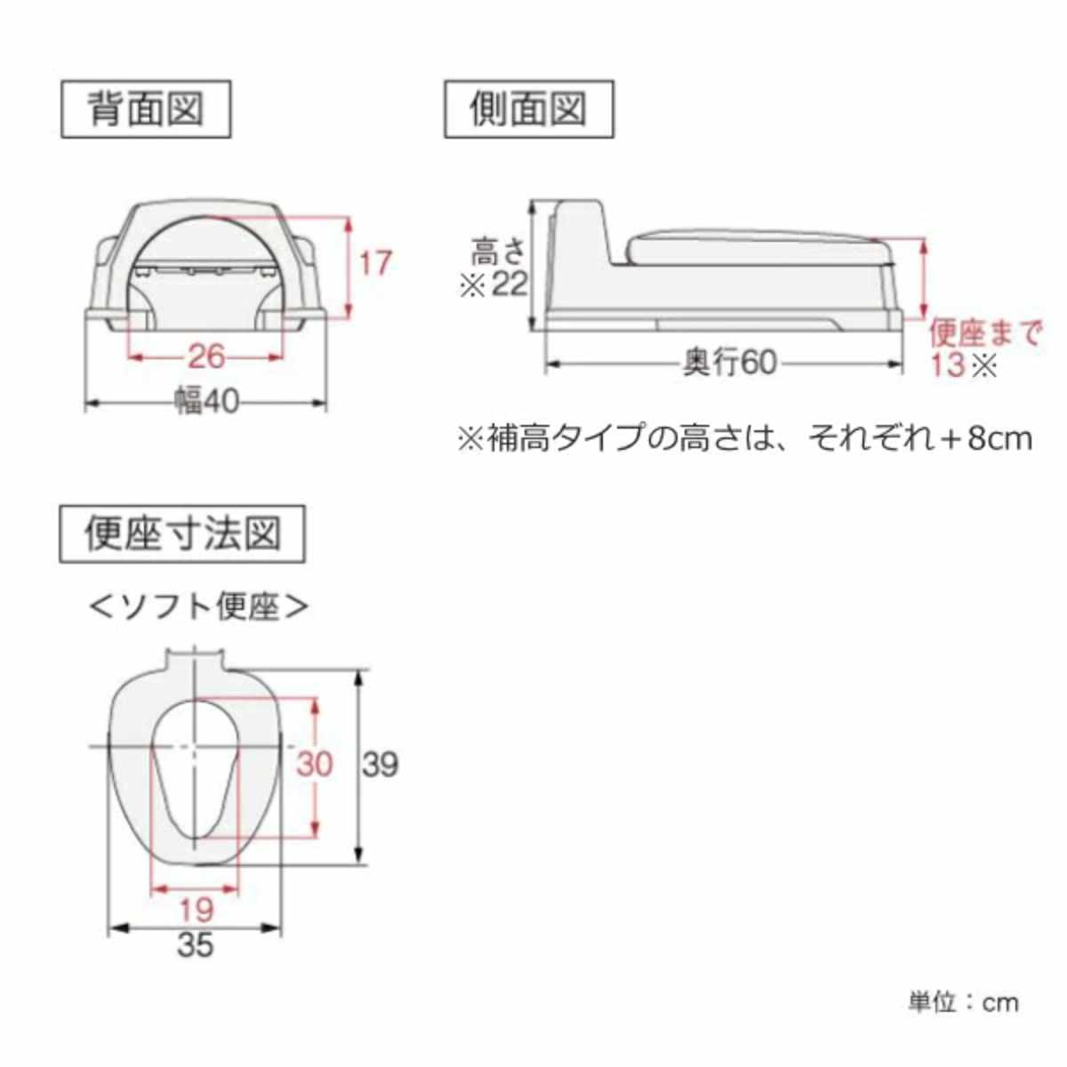 | サイズ | 約 幅40×奥行60×高さ22(cm) (便座までの高さ:13cm) ※補高タイプの高さは、それぞれ+8cm |