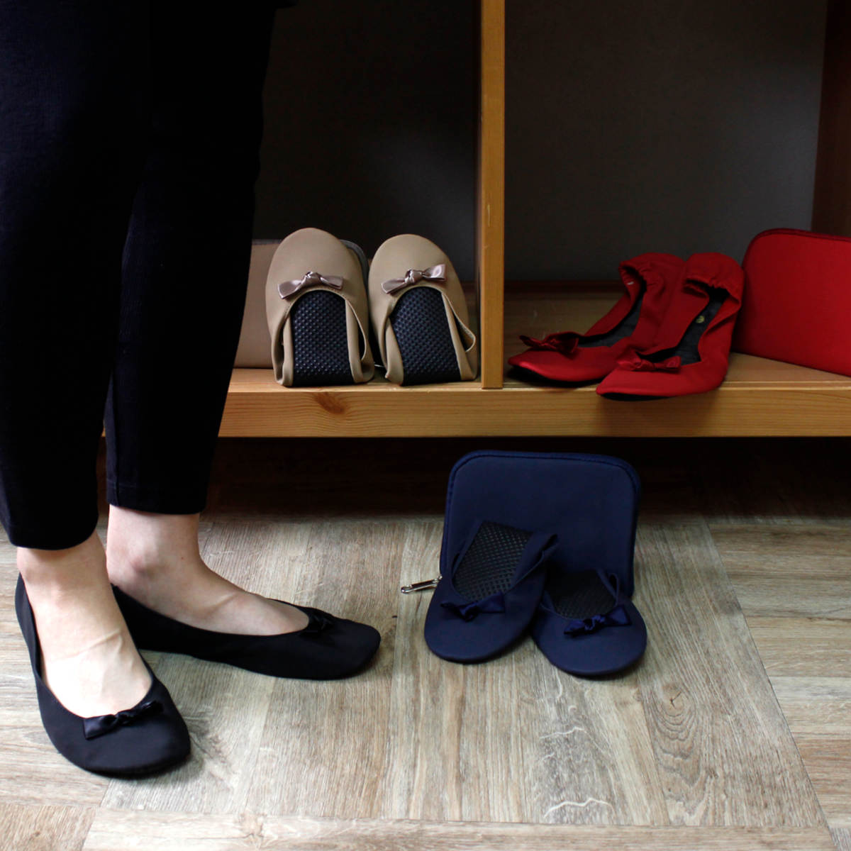 丸いつま先にワンポイントのリボンが女性らしい上品なデザインです。カジュアルにもフォーマルにもマッチし、旅行や学校行事、職場の室内履きなど様々なシーンで活躍します。