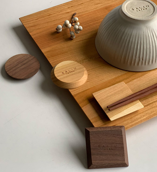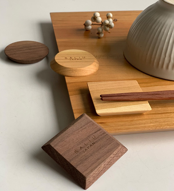 円と角のデザインで、硬く木肌の美しい山桜とブラックウォールナットの4種類。小さいながらも職人の丁寧な仕事がいきる、こだわりのアイテムです。
