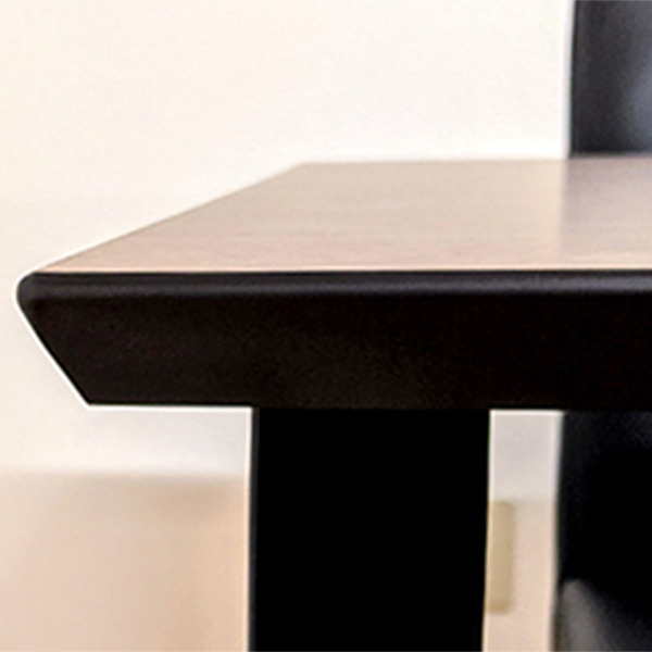 | すっきりシンプル 天板は船底型に加工を施し、黒いフチにすることで、スッキリとした印象に仕上げてあります。 | モダンな雰囲気 木目調の天板とスチールの脚とのバランスも良く、機能的な性能に加えモダンな見た目もこだわっています。 |