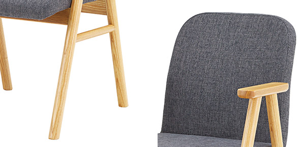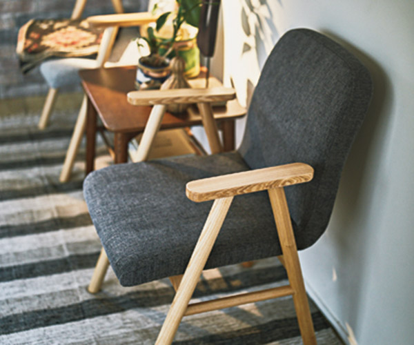 | 穏やかで素直な木目 爽やかな木目も魅力でお部屋に優しい印象を与えます。 | 座面はファブリック素材 夏場は長時間座ってもべたつかず、寒い時期は暖かみがあります。 |