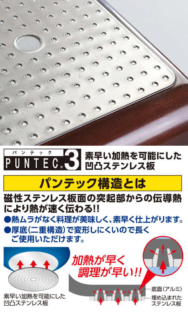 アルミの底面に特殊形状のステンレス板を斜めに深く打ち込むことでより強度が増し、熱などの変形による剥離を防ぎます。独自開発した技術「パンテック加工」により、従来IHクッキングヒーターでは使用不可能だったアルミ製の軽くて使いやすいフライパンが、初めて使えるようになりました。磁性ステンレス板面の突起部から伝導熱により熱が速く伝わります。