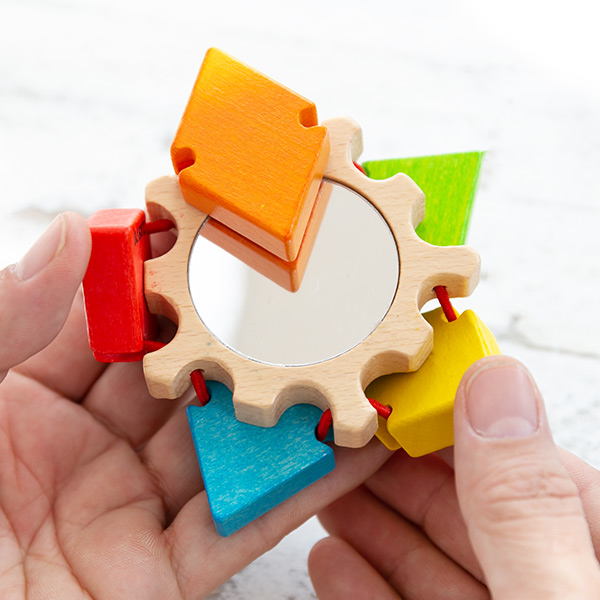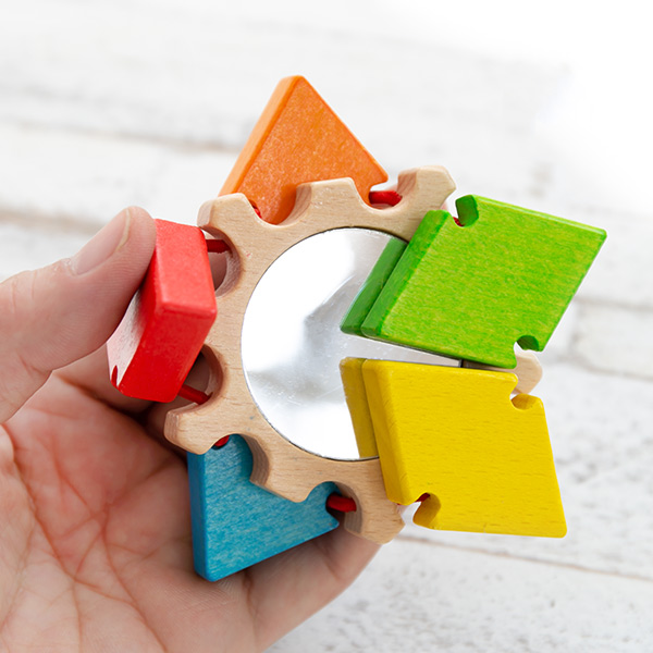 天然色と適度な配色があることで、パーツを動かすことに一層興味が増し、手先などの微細な運動の発達を促します。鏡に映る自分の顔を見れば、赤ちゃんもご機嫌。視覚の発達を促すのにも役立ちます。