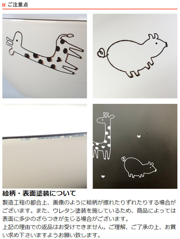 製造工程の都合上、画像のように絵柄が擦れたりずれたりする場合がございます。また、ウレタン塗装を施しているため、商品によっては表面に多少のざらつきが生じる場合がございます。