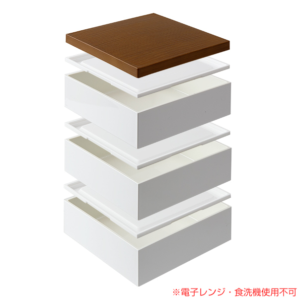 木目調の上蓋が印象的なシンプルでスタイリッシュなデザインの重箱です。正月や運動会などの季節の行事だけでなく、ホームパーティやピクニックでも活躍してくれます。いつもの料理を詰めるだけで、華やかで映える食卓になります。